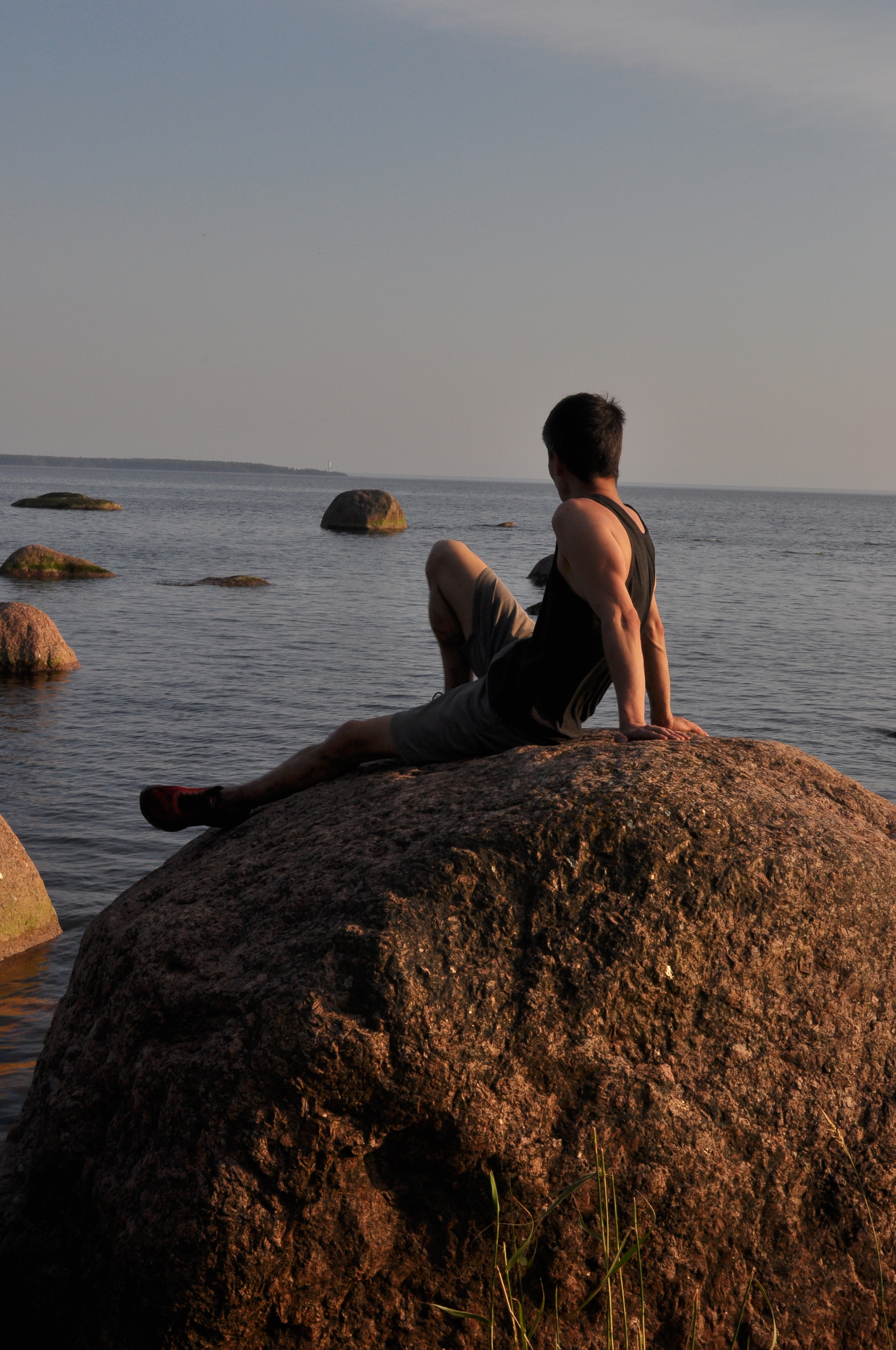 Доехав до развилки тропы, мы приняли решение поехать по западной её части, по берегу Финского залива. Единственное интересное, что там было- развалины домика почтальона в старой финской деревне и огромное количество насекомых. До Смотровой вышки номер два дорога представляет из себя проселочную дорогу с огромным количеством луж. Вид с вышки закрыт деревьями, лучше пройти к камням на берегу. Виды на огромные валуны и залив просто великолепны. Финский залив в этом месте выглядит необычно-огромные валуны и большие острова напротив. Дорога по западной части тропы до первой смотровой вышки представляет из себя старую финскую мощеную дорогу. Булыжники и их остатки торчат в разные стороны, что и подвело нас.