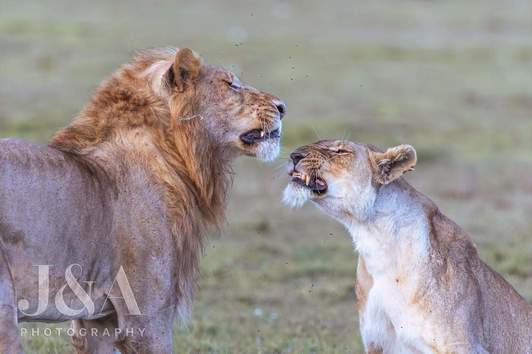 Лев и львица ухаживают друг за другом, причем самка в этот момент несколько неохотно скалит зубы, а самец отвечает ей тем же. Вскоре после этого они спариваются.