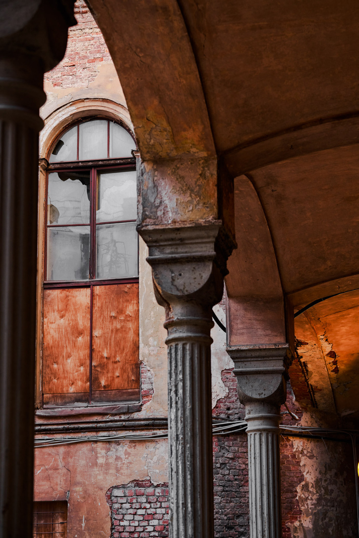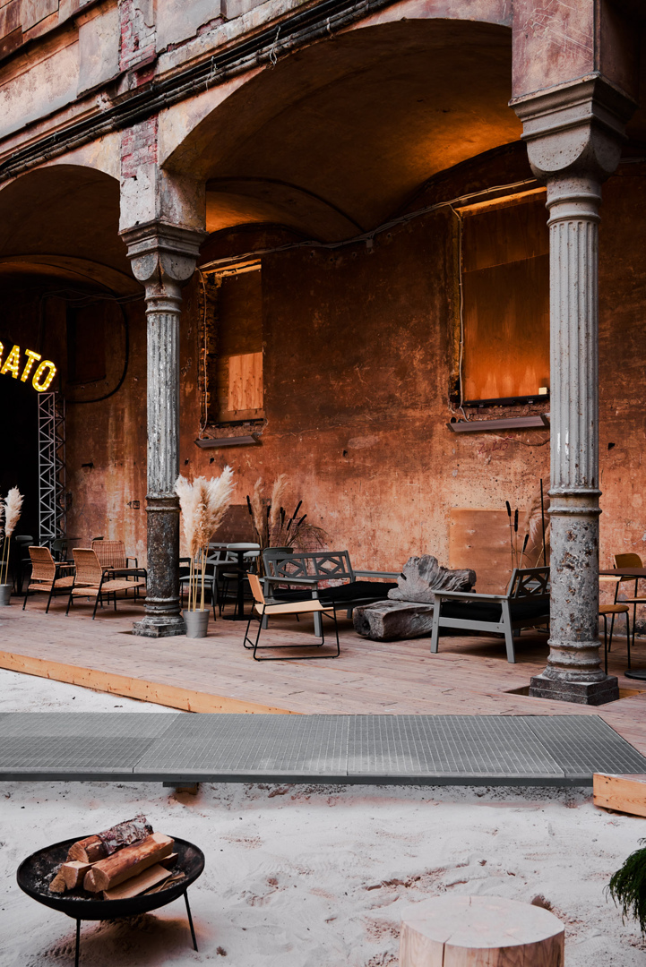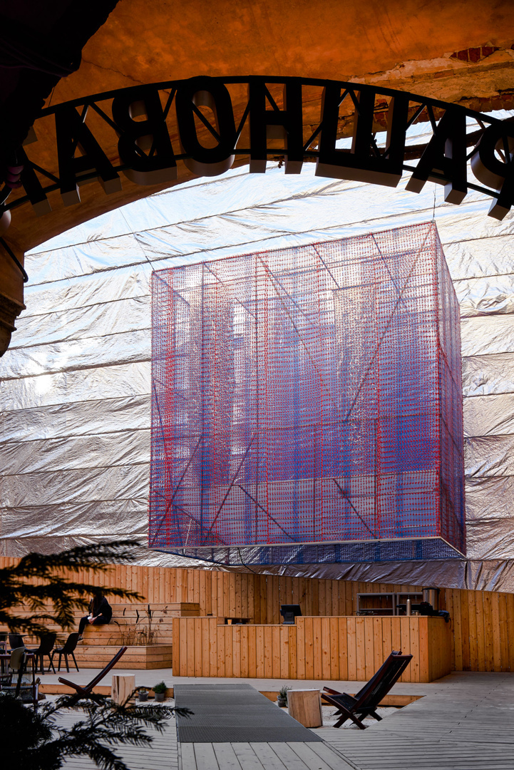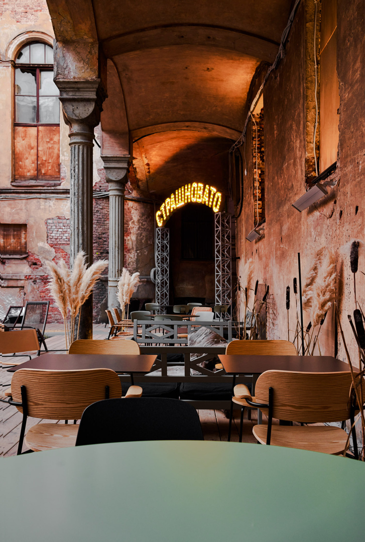 Здание было заброшено 15 лет. Эстетику заброшенного дворца скрывать было просто невозможно — поэтому возникла идея, помимо постоянного проекта, разработать временный поп-ап благоустройства двора.
