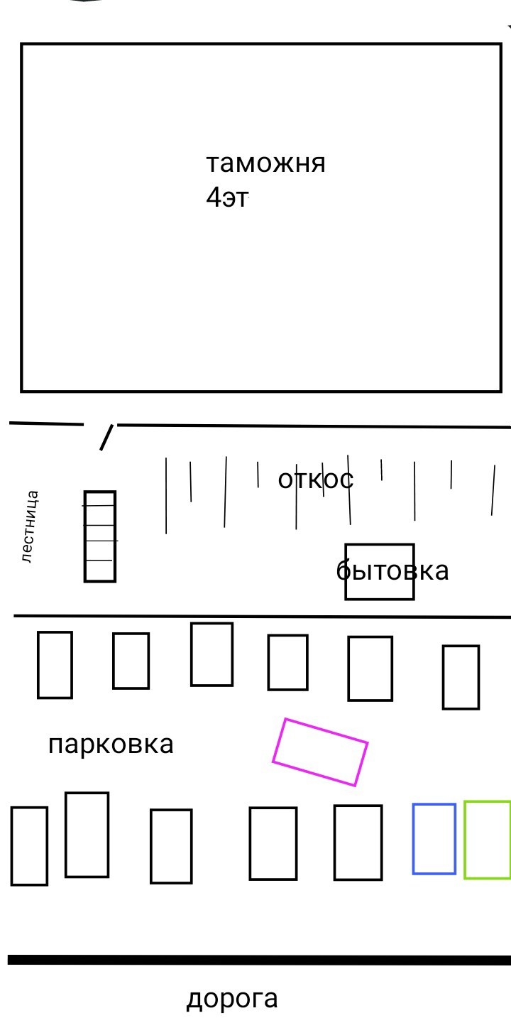Короче, сижу себе на работе в бытовке ,в пикабушечке...краем глаза поглядываю в окно на улице . На парковку подъехала модама лет 25-30 на Тойоте Белте(розовый прямоугольничек) ,вышла и стала копошиться в своем авто. Тем временем, во второй ряд подъехал Крузак(зелёный прямоугольничек) и загородил собой въезд и выезд с парковки(для понимания въезд и выезд весьма условные т.к. она от дороги ничем не отделена и за выезд тут считается одно свободное место во втором ряду) . Модам , завершив свои важные дела села в авто и собралась было уезжать НО увы по понятным причинам выехать ей не удалось. Теперь начинается самое интересное)) модам выскакивает в истерике и начинает стучать по колесам Субару импрезы casa-blanca (синий прямоугольничек). Сигналки на авто не было , соответственно авто убирать ни кто не пришел. До сих пор не понимаю почему она решила что именно он преградил ей путь. Тем временем Крузак свалил восвояси ,но у дамы припекло знатно и она под звонкие маты вылила на лобовуху бедной импрезы полулитровый пакет какого то бифидка , а так же под дворником оставила записку такого содержания: "В следующий раз подумай своей головой , прежде чем загораживать!!!"