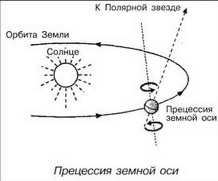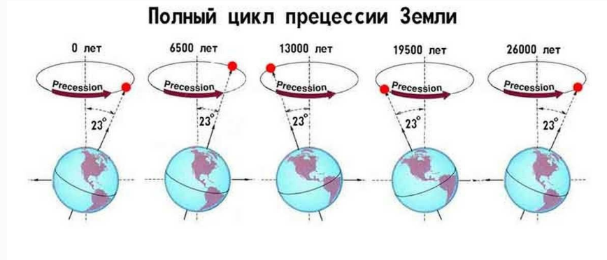 Потому как ещё более двух тысяч лет назад астрономы древнего Египта открыли явление прецессии, при котором ось Земли относительно наклона к Солнцу движется по кругу. Известная многим с детских лет игрушка «волчок» (юла) перед тем как остановиться, начинает раскачиваться, чем больше она замедляется, тем больше раскачивается. Это же явление происходит с Землей и называется прецессией.