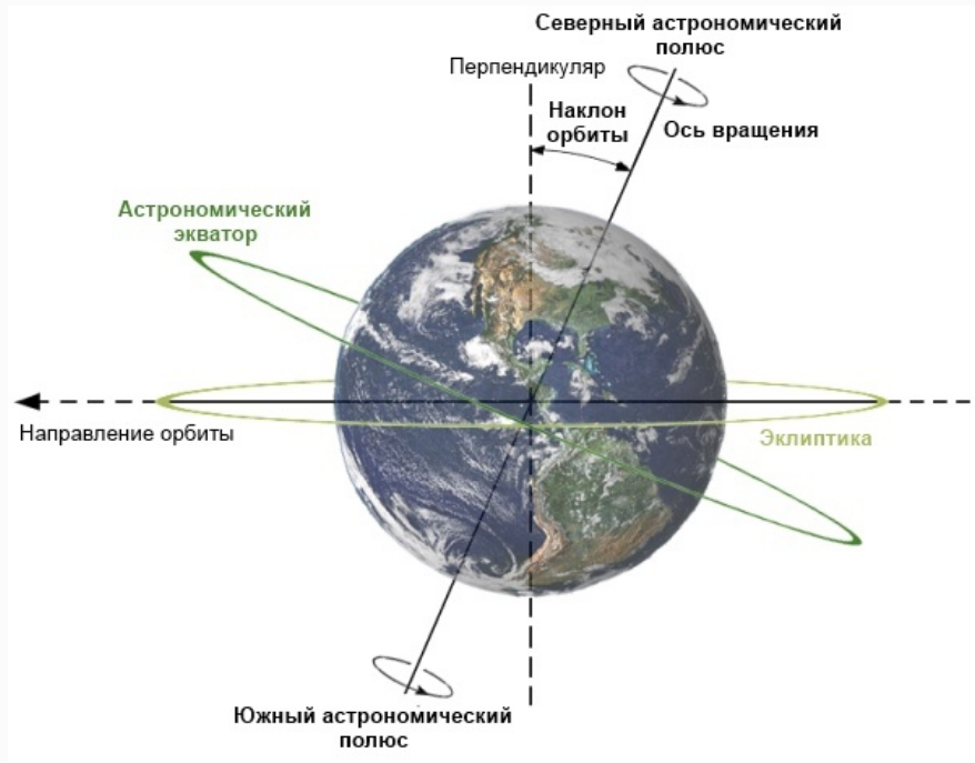 Всем понятно, что одна погода (и температура) на Земле (в частности в Северном полушарии) будет, когда Земля подставит под лучи Солнца побережье Африки. И совсем другая, когда под тем же углом наклона под те же жаркие лучи — северные берега Сибири и Скандинавии.