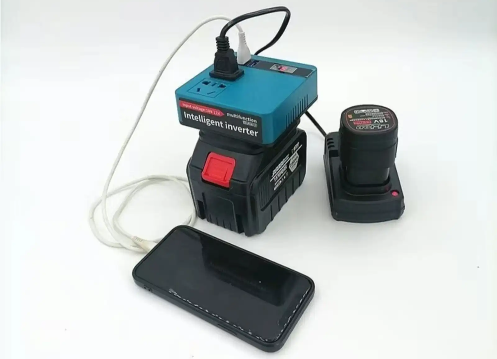 Интересный адаптер на аккумуляторы от электроинструментов Makita. Это инвертор, который преобразует напряжение 21В от аккумулятора в 220В и можно пользоваться розеткой. Также имеет 3 USB порта для зарядки устройств. Стоит такой около 998 руб. Ссылка на него