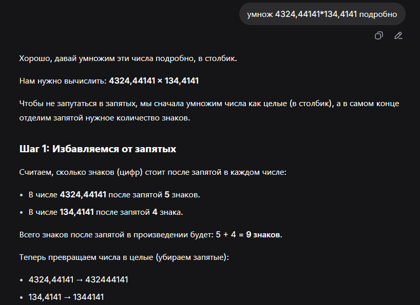 Почему так произошло? А он не умеет считать, он лишь предполагает какое следующее слово будет. Разработчики новых моделей, конечно, научили считать ИИ, часто используют WolframAlpha (сайт, который без ИИ всё идеально считает). Т.е. модель обращается к сайту и просит посчитать, он даёт результат и ИИ пересылает его нам.