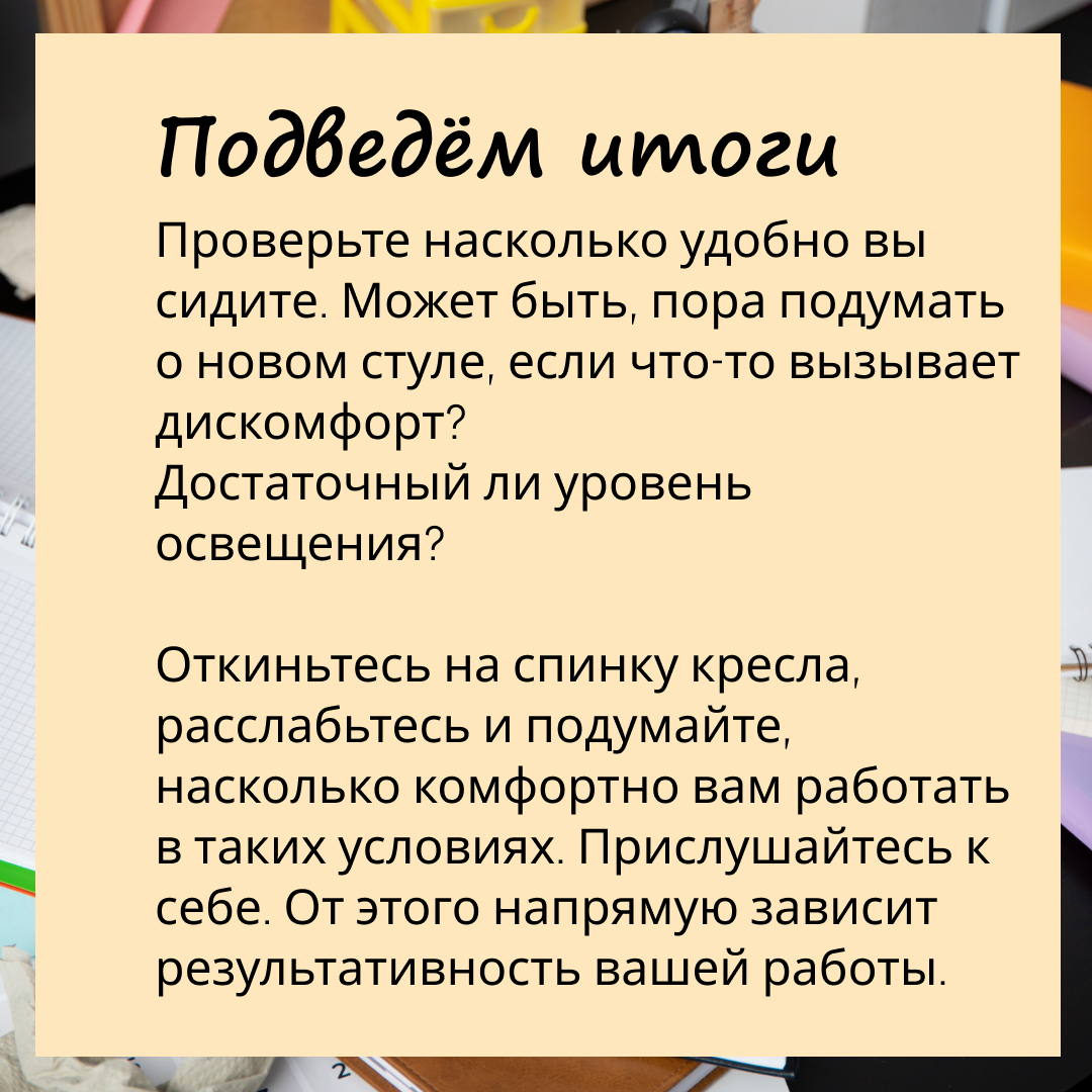 Если вы сейчас уже работаете, или когда начнёте – осмотритесь вокруг. Насколько вам комфортно сидеть, нет ли предметов, которые мешают?