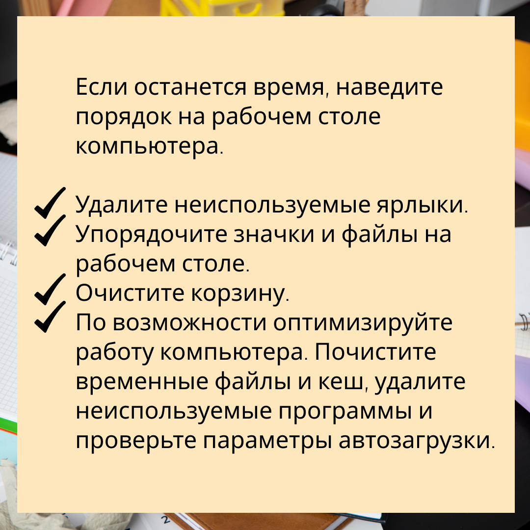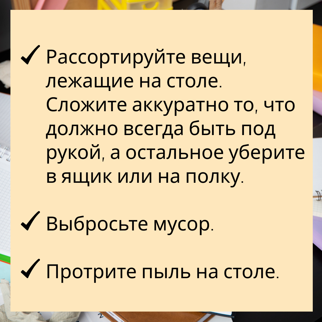 Посмотрите советы по приборке рабочего места в карточках к посту.
