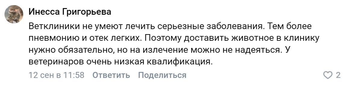 © Заметили странное дыхание животом, других признаков не было (ни синего языка, ни кашля), думали может это только кажется, ведь она уже старенькая( 15 лет) . В следующие 2 дня стала вялая, отказывалась от еды. Мы повезли в вет клинику, сделали анализы. Обнаружили жидкость в лёгких, предварительный диагноз - пневмония. Прописали антибиотики, дали кошке их же (прям в клинике) и отправили наблюдать домой. В эту же ночь состояние в 10 раз стало хуже, если раньше она дышала тяжело но с нормальным ритмом, то ночью её дыхание походило на то, будто она бежит марафон (при этом открытого рта не было), поехали с ней в стационар. Там она провела в кислородной камере сутки, антибиотики не помогали, становилось всё хуже, в конце подключили к ИВЛ... и у неё не выдержало сердце...