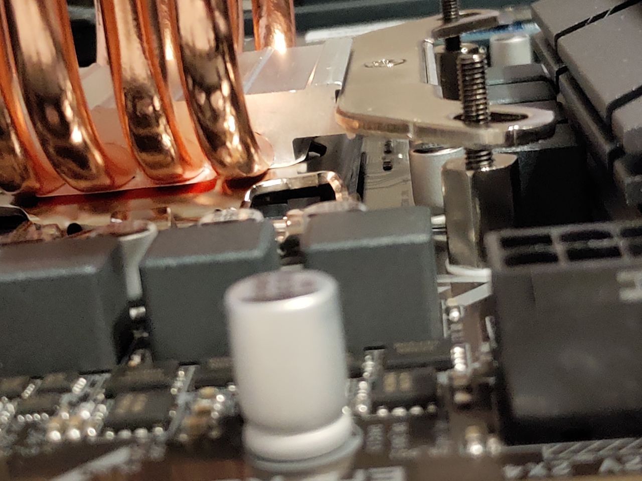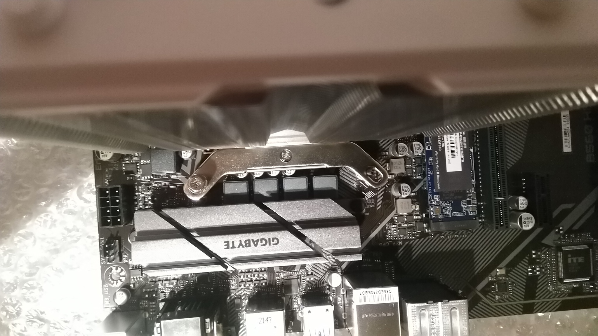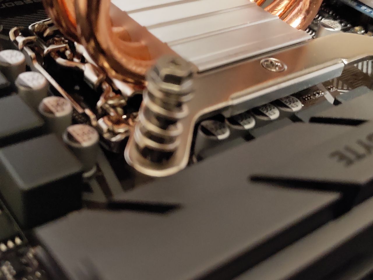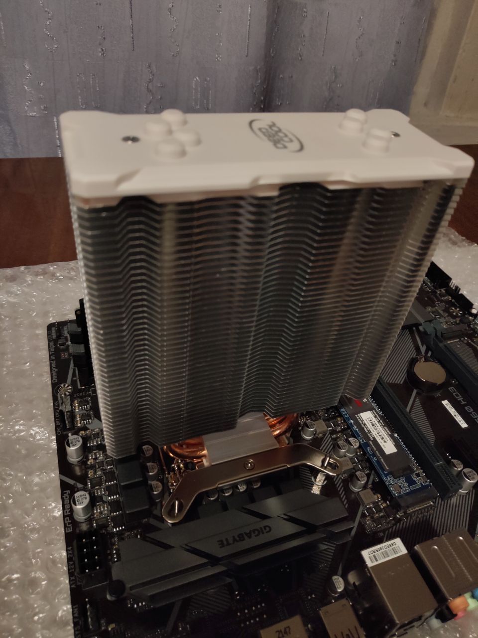 Устанавливают куллер deepcool gte v2 на сокет lga 1200 на материнке форм фактора ATX ( b560 gigabyte hd3). При наложении куллера с неснятой защитной пленкой на материнскую плату куллер не прилегает полностью, железная ножка находится прямо под конденсаторами и перекрывает примерно 75% конденсаторов (фото под углом могут создать впечатления, что это не так) и есть опасения, что при прикручивании болтов (такие как на предпоследнем фото) и соответственном опускании куллера конденсаторы могут повредится из за того что будут прижаты, верны ли мои страхи? И всё ли я правильно установил. При том если перевернуть куллер, то конденсаторы он не будет задевать, но тогда вентилятору неоткуда будет забирать воздух