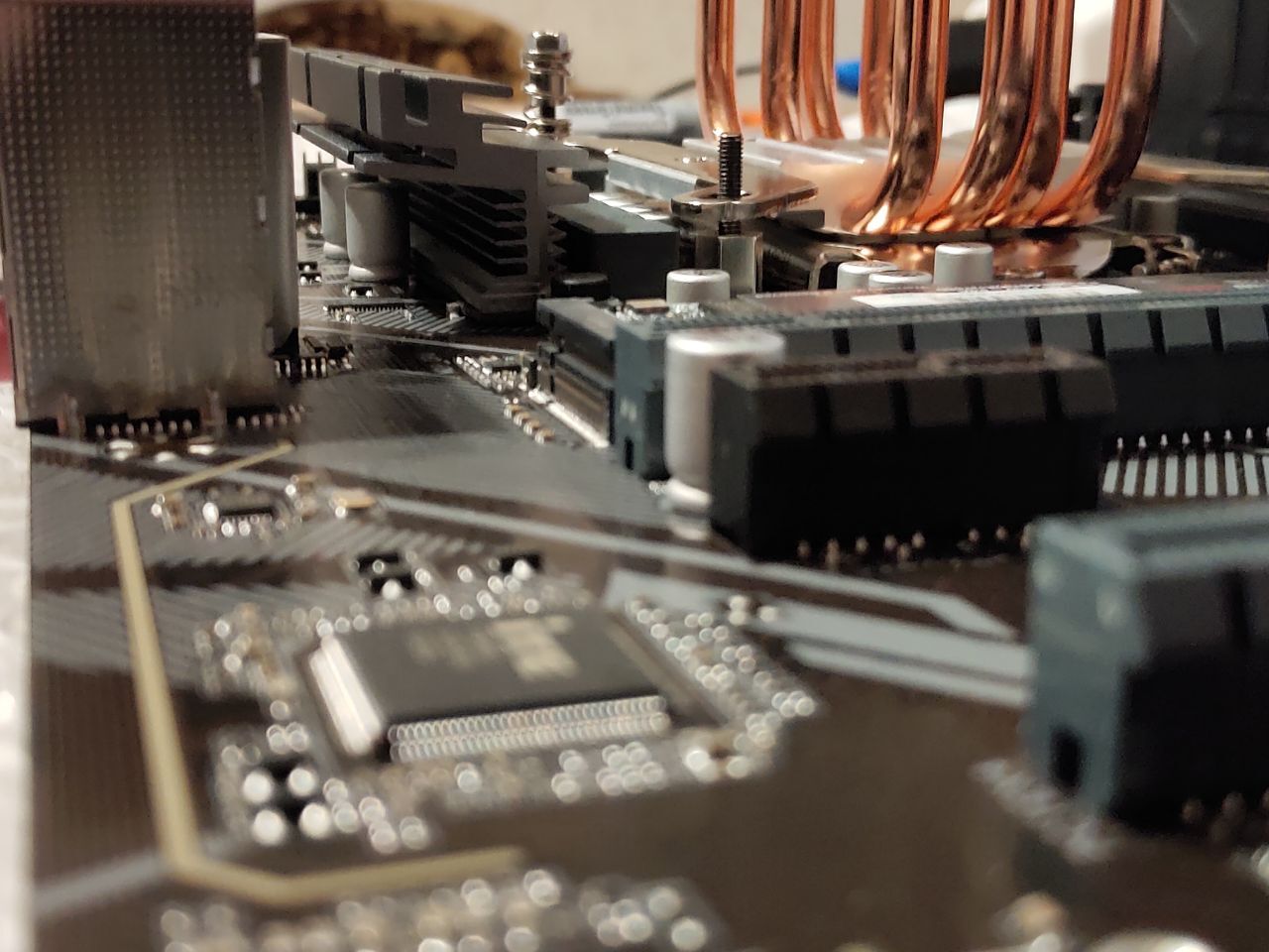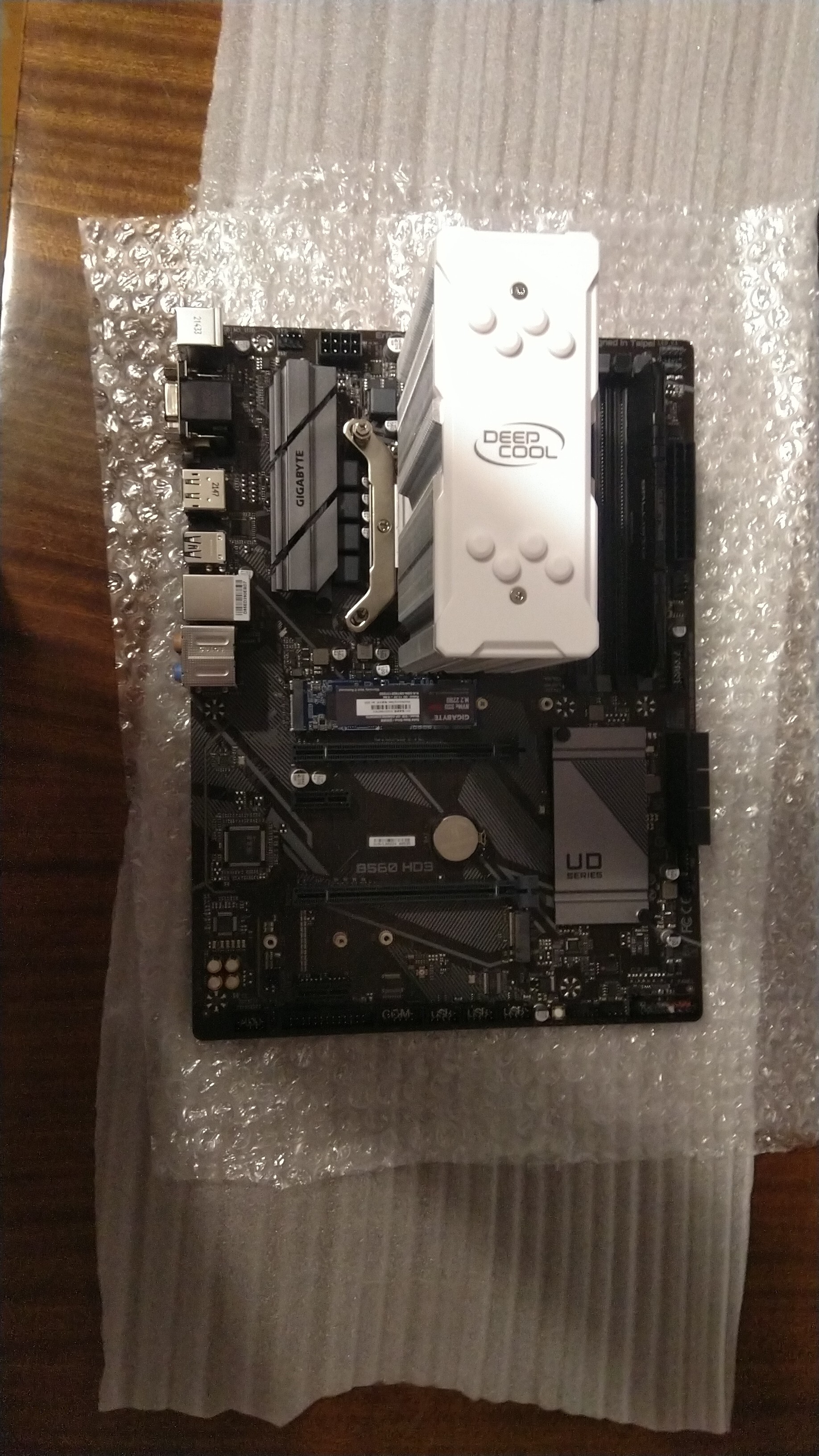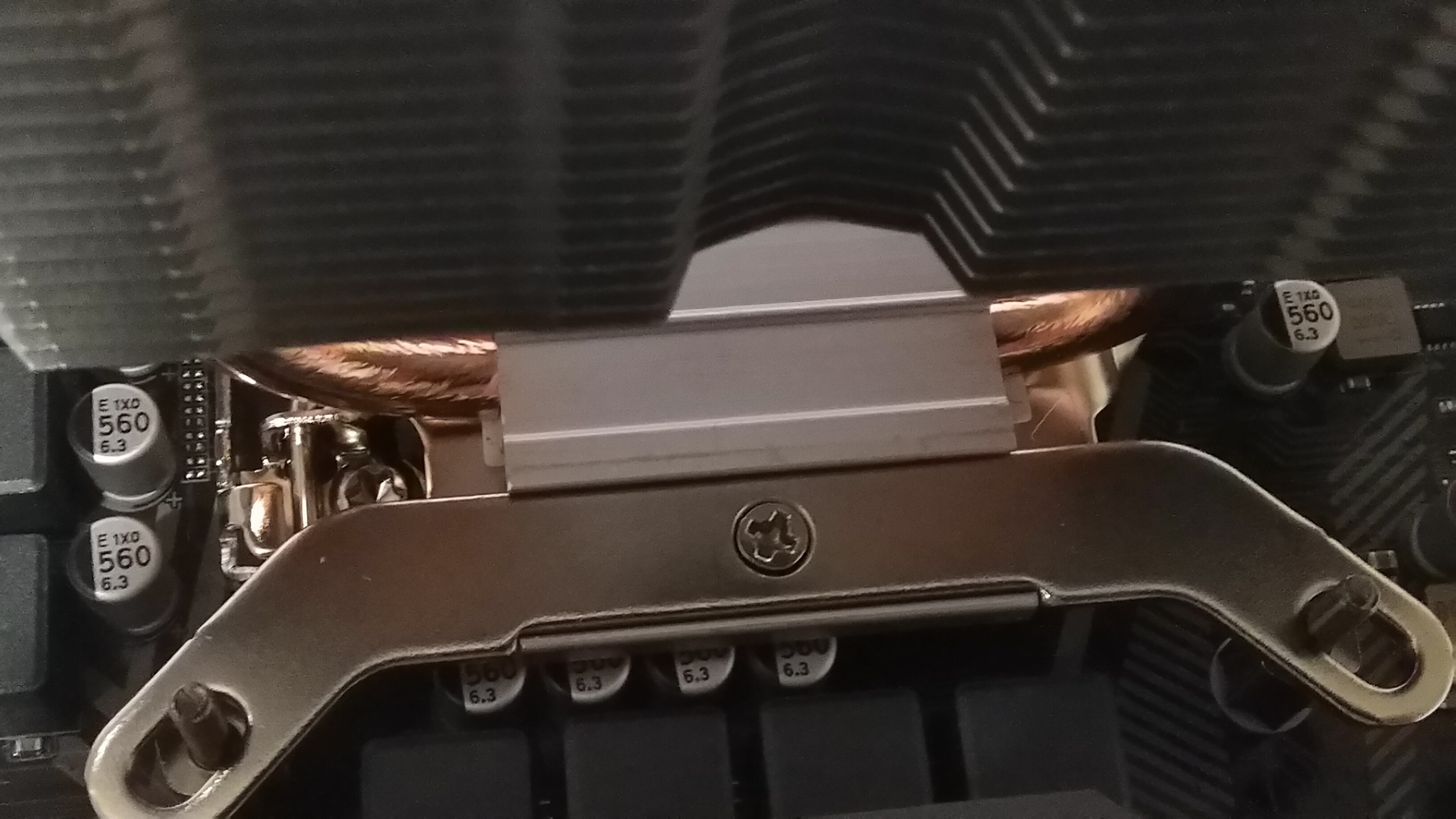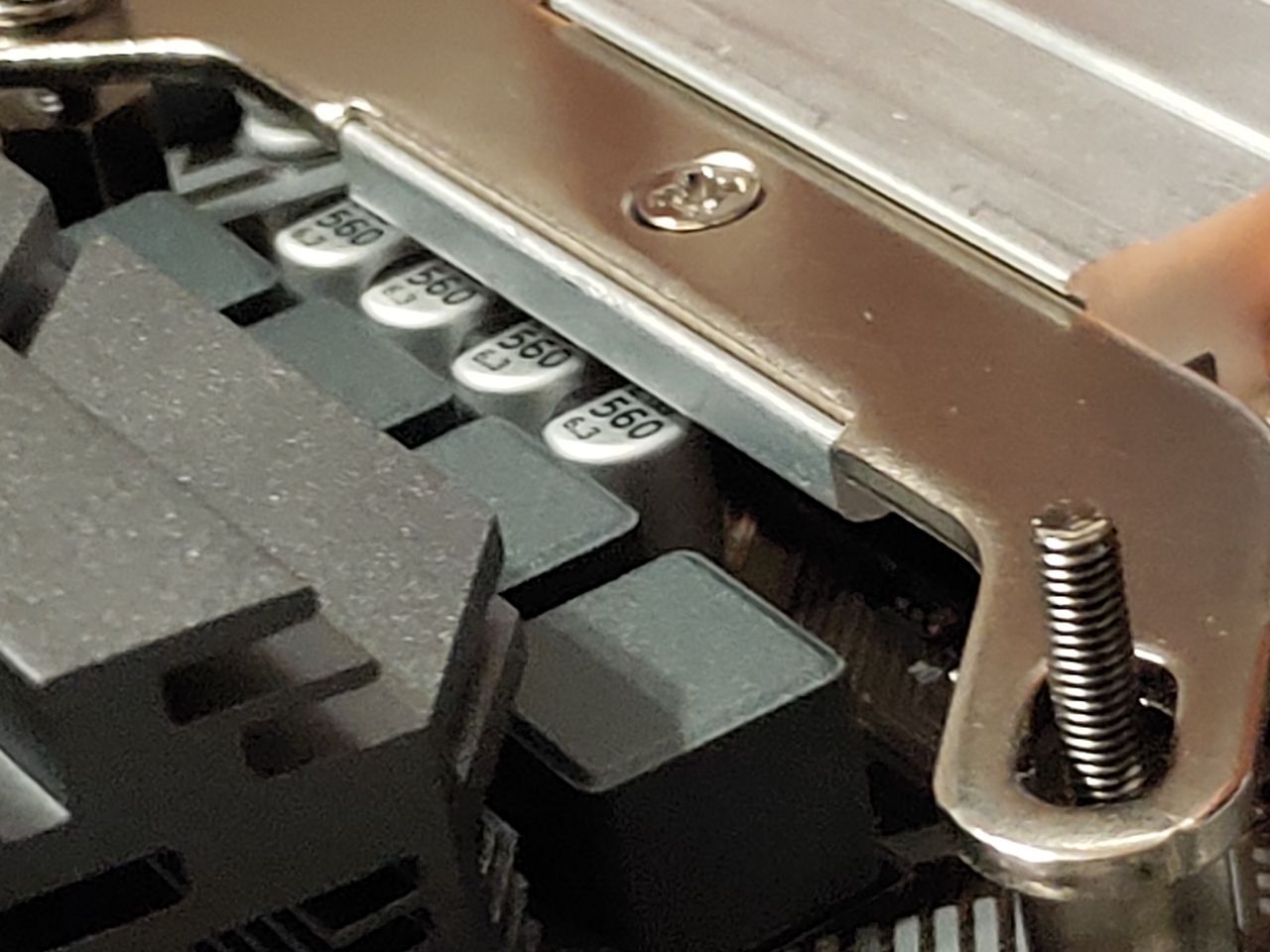 Устанавливают куллер deepcool gte v2 на сокет lga 1200 на материнке форм фактора ATX ( b560 gigabyte hd3). При наложении куллера с неснятой защитной пленкой на материнскую плату куллер не прилегает полностью, железная ножка находится прямо под конденсаторами и перекрывает примерно 75% конденсаторов (фото под углом могут создать впечатления, что это не так) и есть опасения, что при прикручивании болтов (такие как на предпоследнем фото) и соответственном опускании куллера конденсаторы могут повредится из за того что будут прижаты, верны ли мои страхи? И всё ли я правильно установил. При том если перевернуть куллер, то конденсаторы он не будет задевать, но тогда вентилятору неоткуда будет забирать воздух