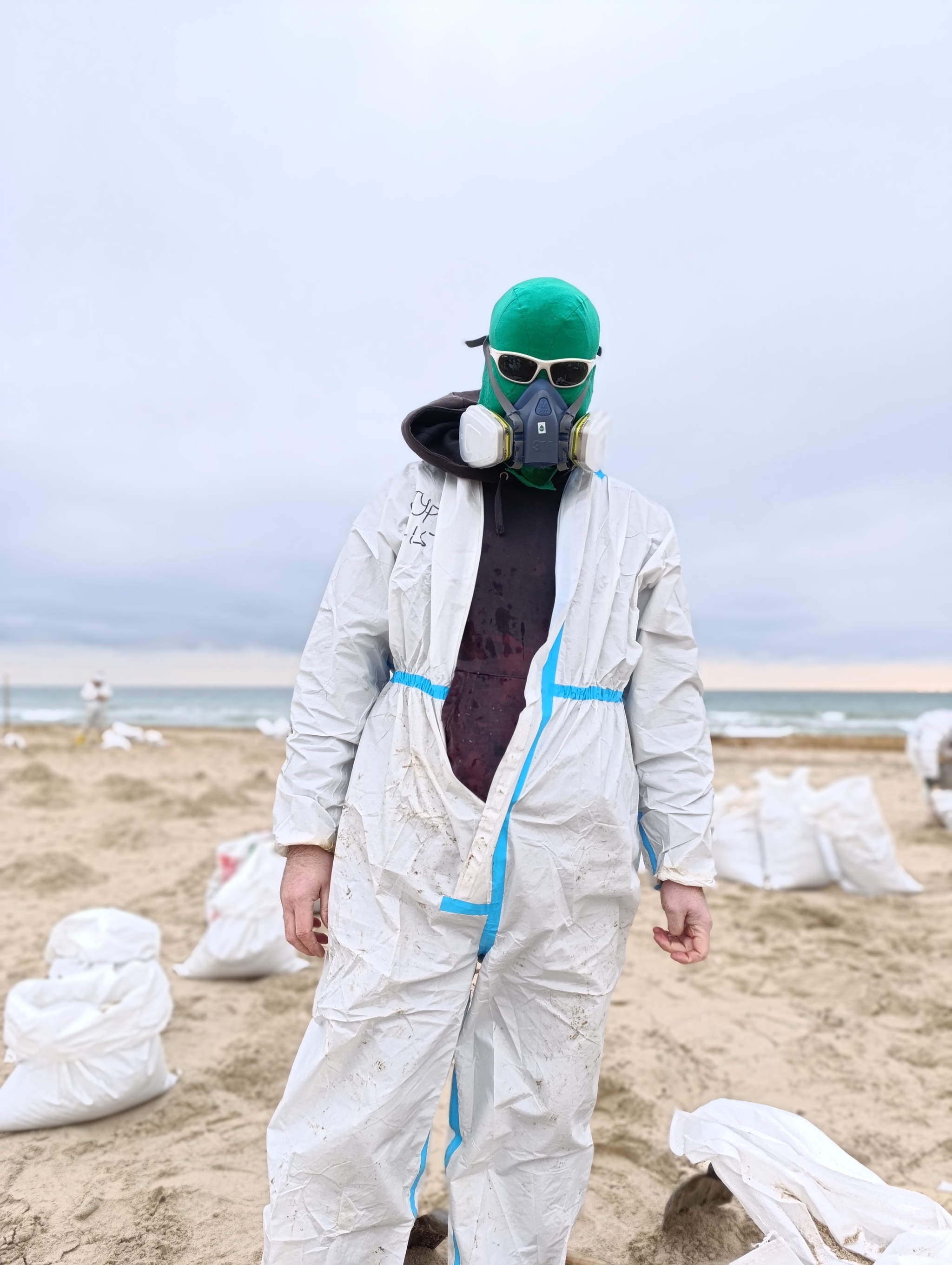 Бугазская коса. Такой жести как в первые дни уже нет. Но теперь проблема в другом. Слои мазута находятся под песком. В разных местах. Мы соскребали видимые куски в кучки. Перегружали их в мешки.