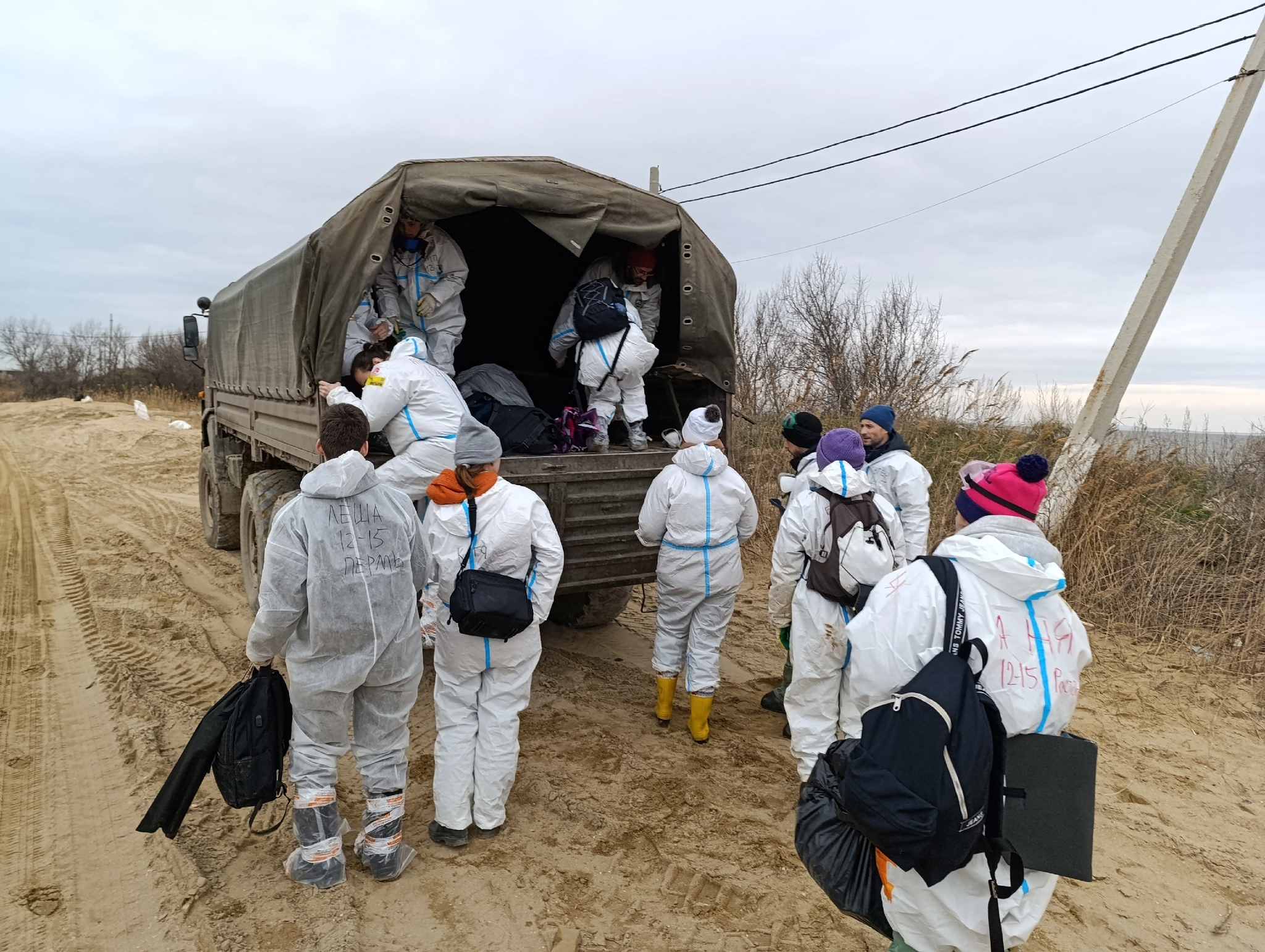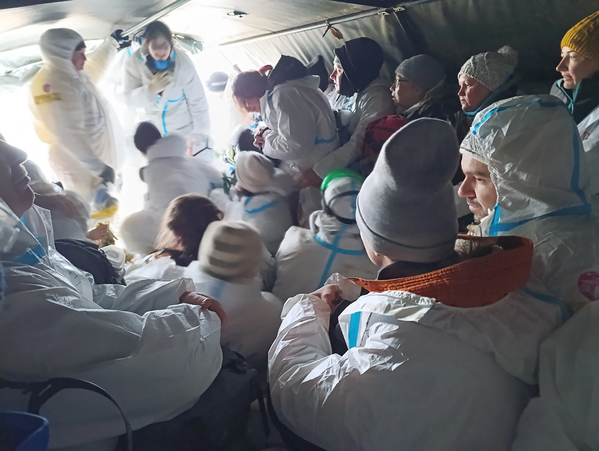 Загрузились в микравтобусик и поехали в штаб. Там был еще один перекус. Всем раздали костюмы, маски, перчатки и очки. Оттуда выдвинулись на точку сбора мазута.