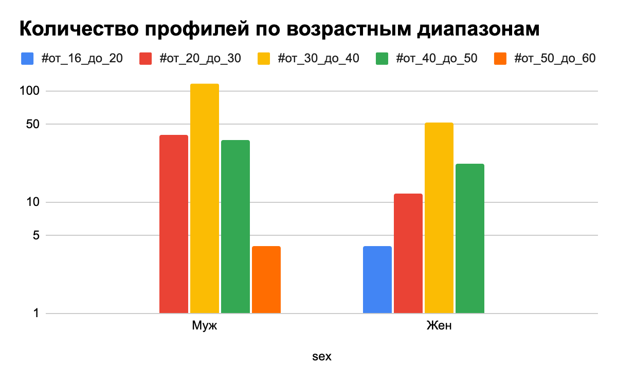 За 15 дней было создано 294 профиля, разбивку по возрастам и полу видно на диаграмме