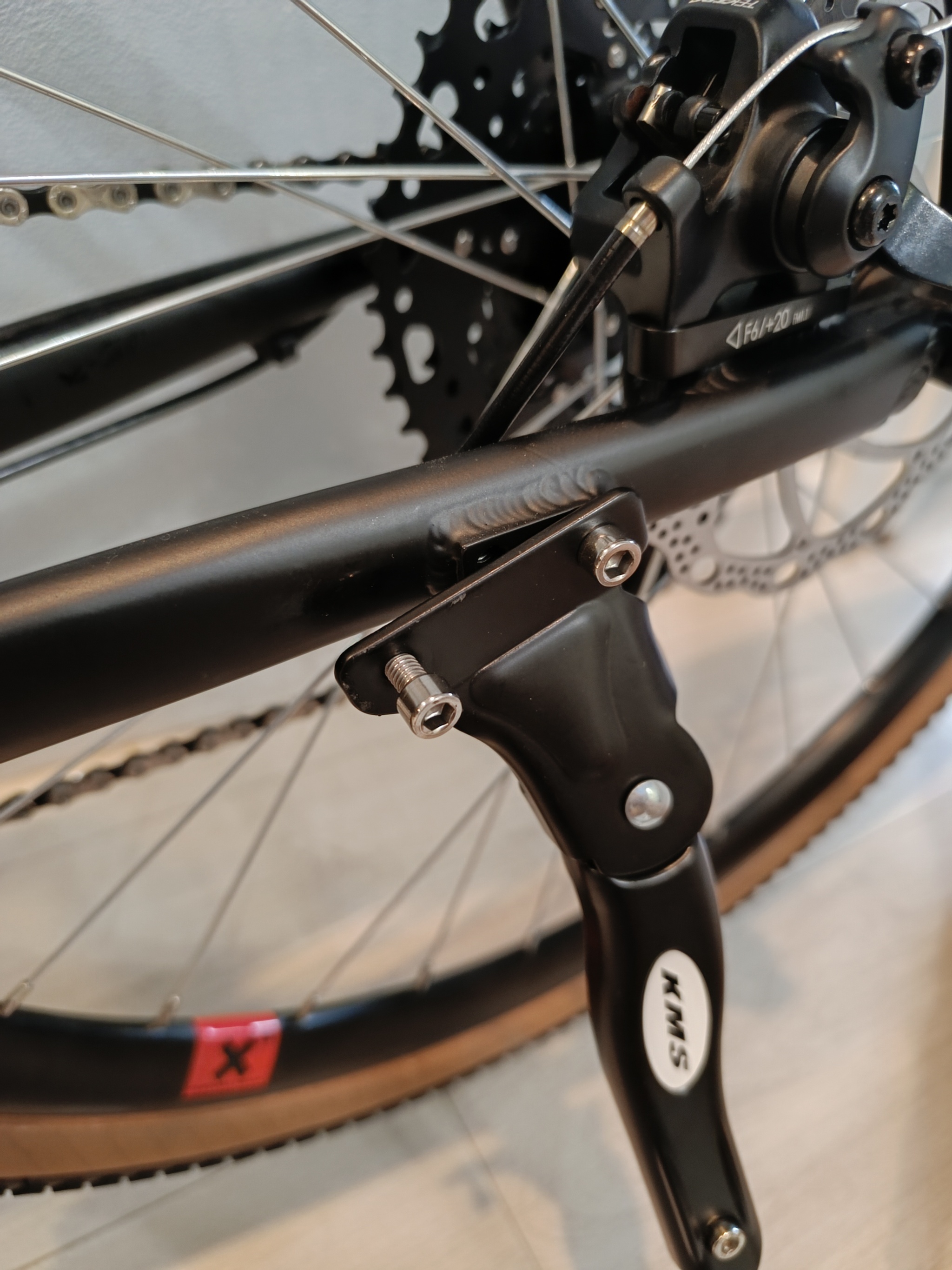 Долго думал брать или нет подножку, решил на всякий случай иметь в запасе, для поездок чисто в городе, но не угадал. Лень было сходить и замерить расстояние. Думаю, просверлю два новых отверстия и закреплю по центру. Подножка в целом нормальная, по высоте регулируется, алюминиевая, 300 грамм веса.