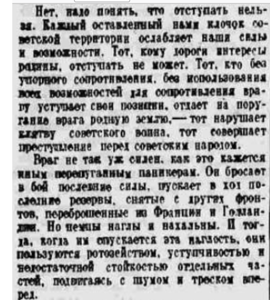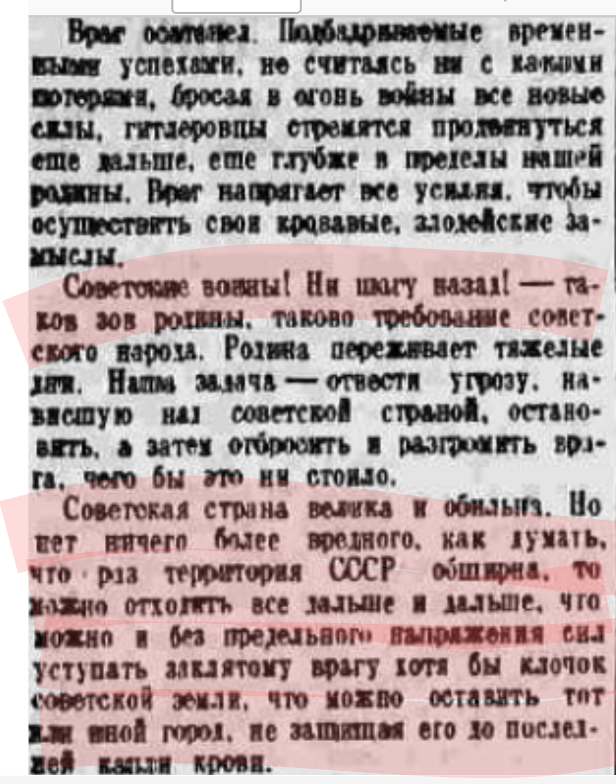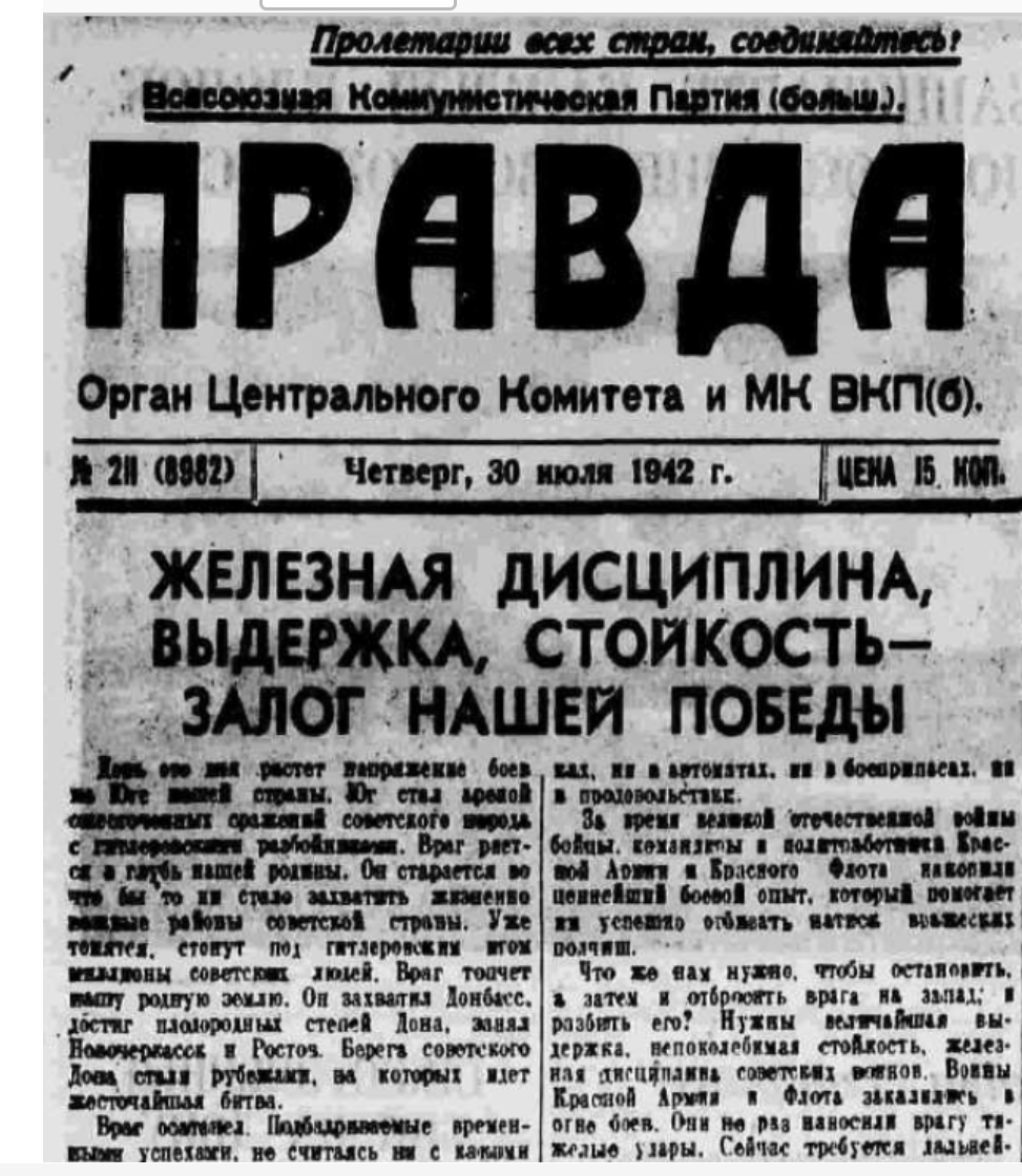 Ясное дело, что в этом номере "Правды" от 30 июля 1942 года не было вот этого, например: "Часть войск Южного фронта, идя за паникёрами, оставила Ростов и Новочеркасск без серьёзного сопротивления и без приказа Москвы, покрыв свои знамёна позором. Население нашей страны, с любовью и уважением относящееся к Красной Армии, начинает разочаровываться в ней, теряет веру в Красную Армию, а многие из них проклинают Красную Армию за то, что она отдаёт наш народ под ярмо немецких угнетателей, а сама утекает на восток"