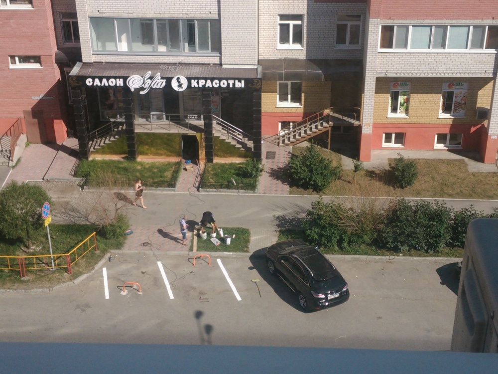 Вот таких пару дней назад кадров увидел у нас в городе. Сначала подумал, что возможно для инвалидов места делают или еще что, потом прикинул, что на дорожников то чет не похоже, а когда увидел ,как они разметку делают, так вообще поржал от души. Ладно вы решили стырить место у местных жителей, так додумались по кривой палке мерить и чертить. После этого все сомнения отпали сразу, в итоге я так понял они пол дня провыделывались ,прочертили, установили заборы эти, далее под вечер когда начали ставить третий. Сижу уже в нете ищу, куда хоть позвонить то можно узнать, че за нафиг, пока искал ,смотрю подошли какие то мужики к ним, минут 30 разговоров, мужики ушли, а парни очень резво стали заборы вытаскивать (посадили хорошо, выкопали лунки, зацементировали и тд), в обещем быстро не получилось =) Развязка на фото, судя по тому, что провода из салона красоты, то штраф им светит 25 рублей за подобной, сколько выписали по факту хз =)