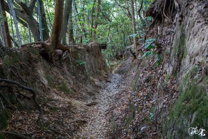 Передохнув у храма после тяжёлого крутого подъёма вновь отправился наверх. Слева - очень крутой подъём, густой лес и ни малейшего намёка на то, что там вообще ходят люди. Справа - овраг. Впереди - старая асфальтированная дорога в колдобинах заваленная опавшими ветками, шишками, листвой, камнями и землёй. Иногда попадались куски асфальта, а среди веток проглядывался бетон. Чем выше в гору, тем меньше намёков на то, что здесь вообще есть дорога. В какой-то момент дорога сузилась, и я шёл по поваленным брёвнам, а дорога стала походить не то что на лесную тропу, а скорее на канаву слива дождевой воды.