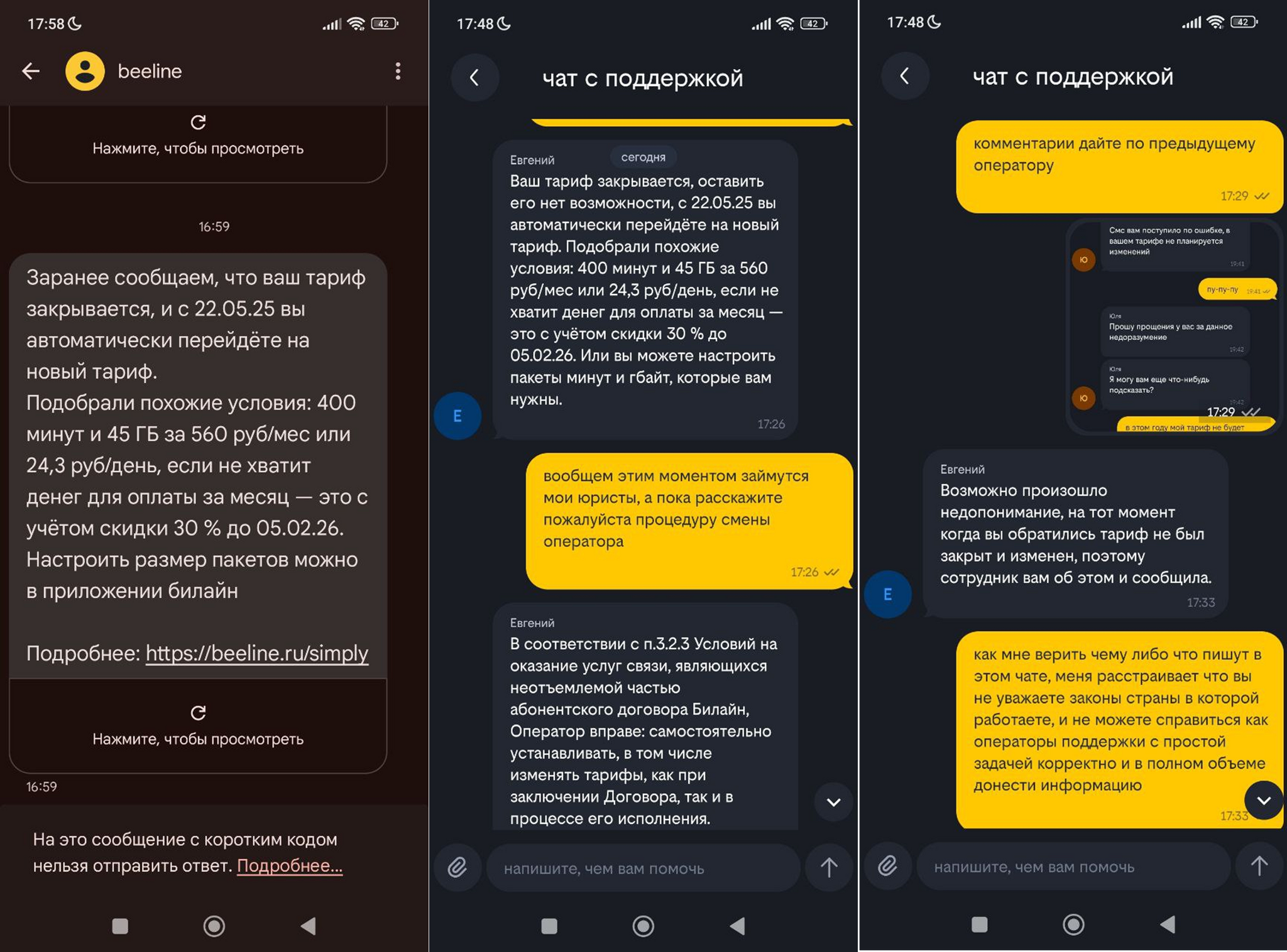 Подавать жалобу в Роспотребнадзор, обращаться в в Роскомнадзор, писать претензию в Билайн, а также досудебную претензию в Билайн, чтобы оставить мне мой тариф, если это возможно. Также будут требовать компенсацию денежных убытков, компенсацию морального вреда, и, возможно штраф до 50% от суммы в мою пользу за отказ добровольно удовлетворить требования.