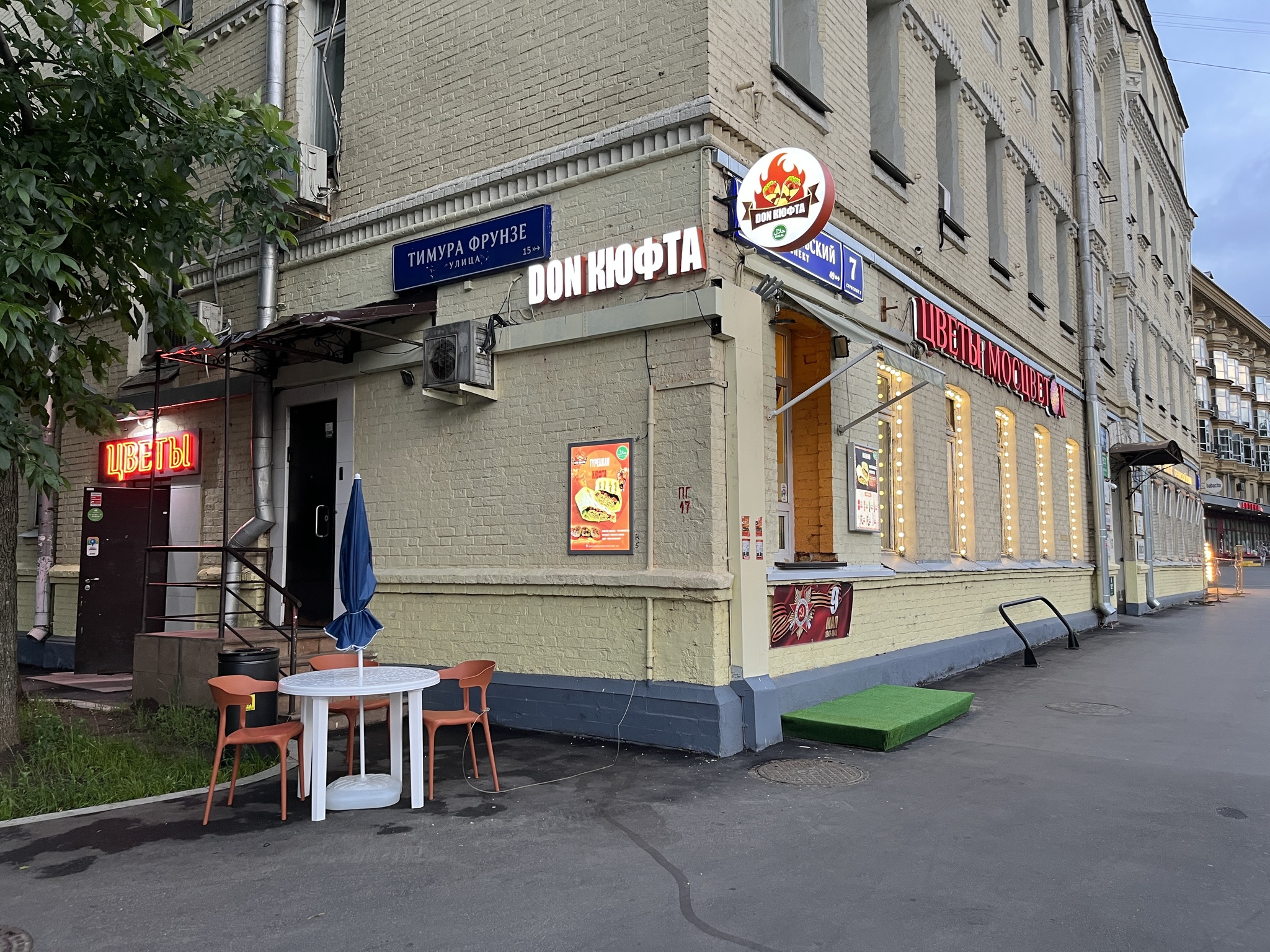 Точный адрес: Комсомольский проспект, 7 (это на углу проспекта и улицы Тимура Фрунзе, пять минут пешком от метро). Раньше в этом окошке был «Донер кофе» с донерами от 200 до 310 рублей, включая вегетарианский с фалафелем, но ничто не вечно под луной.