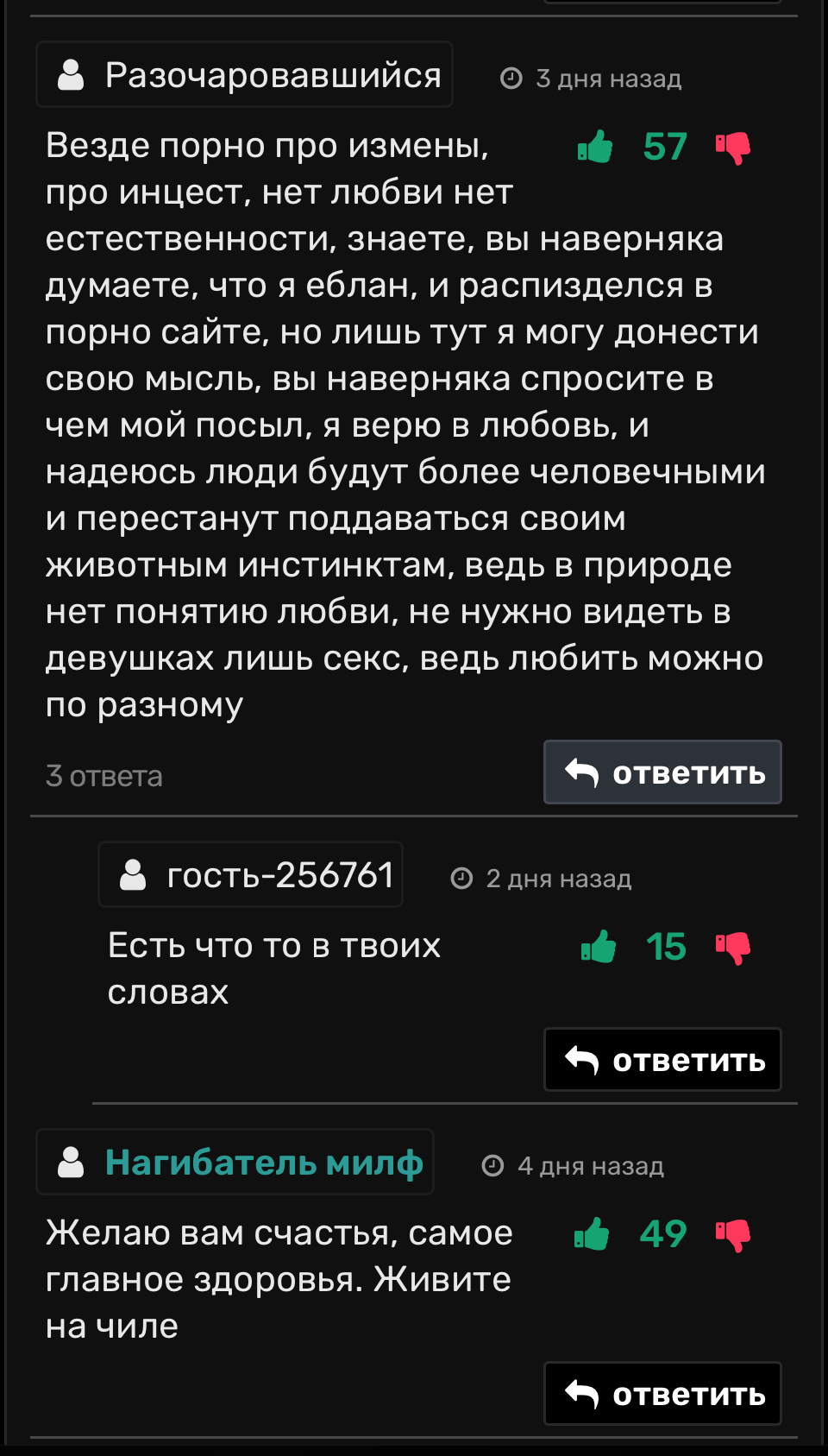 6 2bitCharlie Приличные люди, добра им 4 месяца назад Приятно читать общение между воспитанными людьми, даже в комментариях порно сайте Юмор Комментарии Диалог Ещё 0