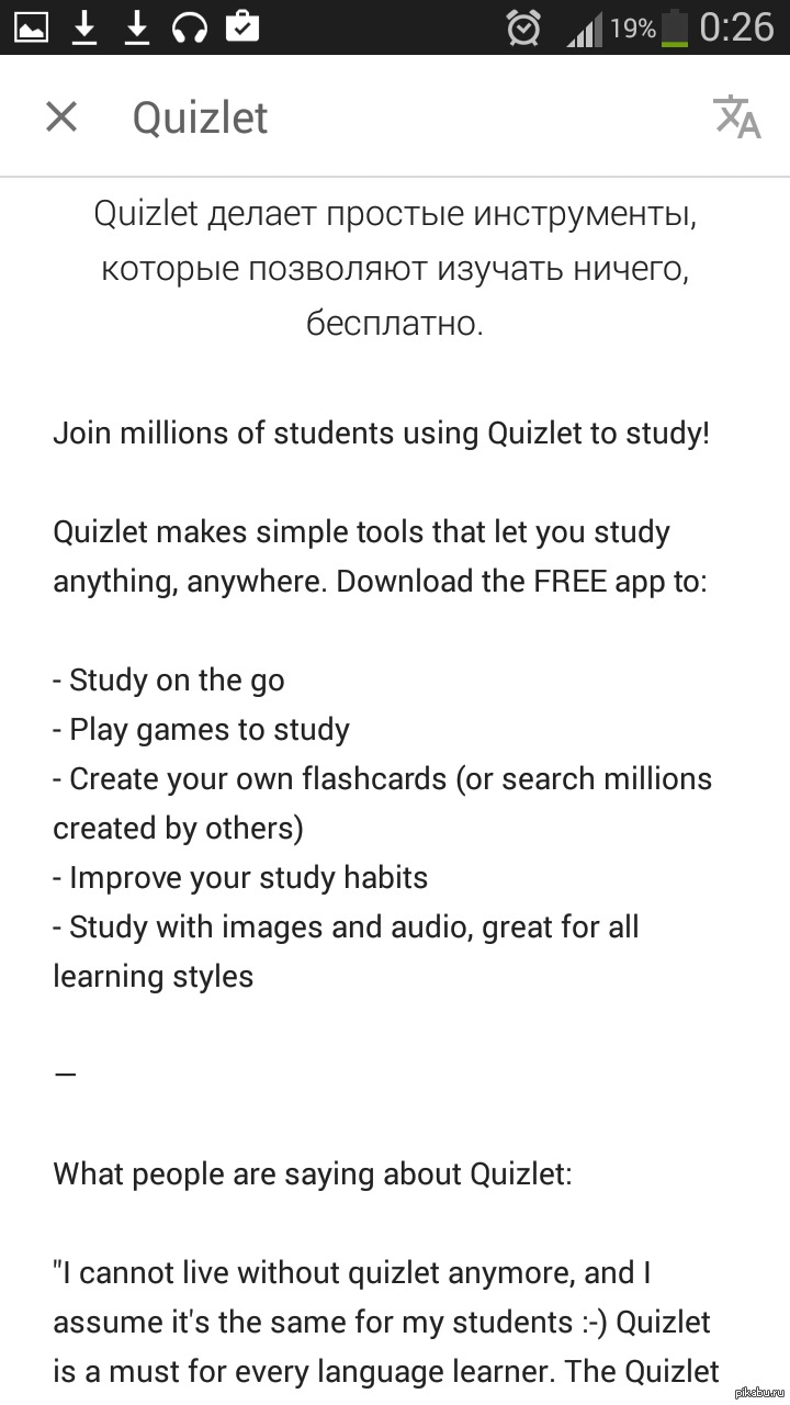 RevanTheJedi 10 лет назад Приложение для изучения языков... Не гугл ли транслейт я вижу? Инструменты, которые позволяют делать НИЧЕГО! [моё] Quizlet Google Play Может чья-то глупая шутка Так ничего или все?