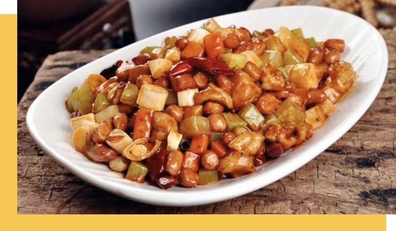 Блюдо сычуаньской кухни из мяса цыпленка с арахисом и перцем чили. В некоторых ресторанах это блюдо можно заказывать в менее остром формате. Помимо курицы с арахисом там ещё овощи есть.
