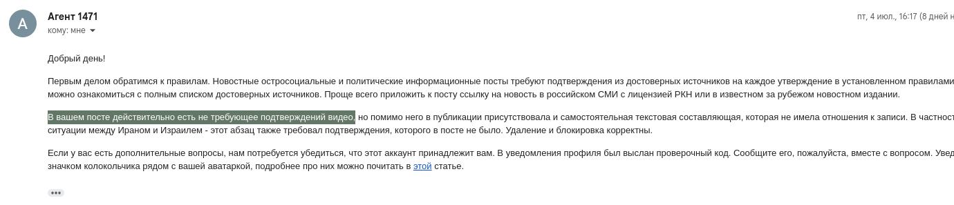 Я в непонятках. Что я же я нарушил?! Делаю обращение в техподдержку и описываю ситуацию., мол новость. К новости приложил видео с Трампом. Все "по закону".