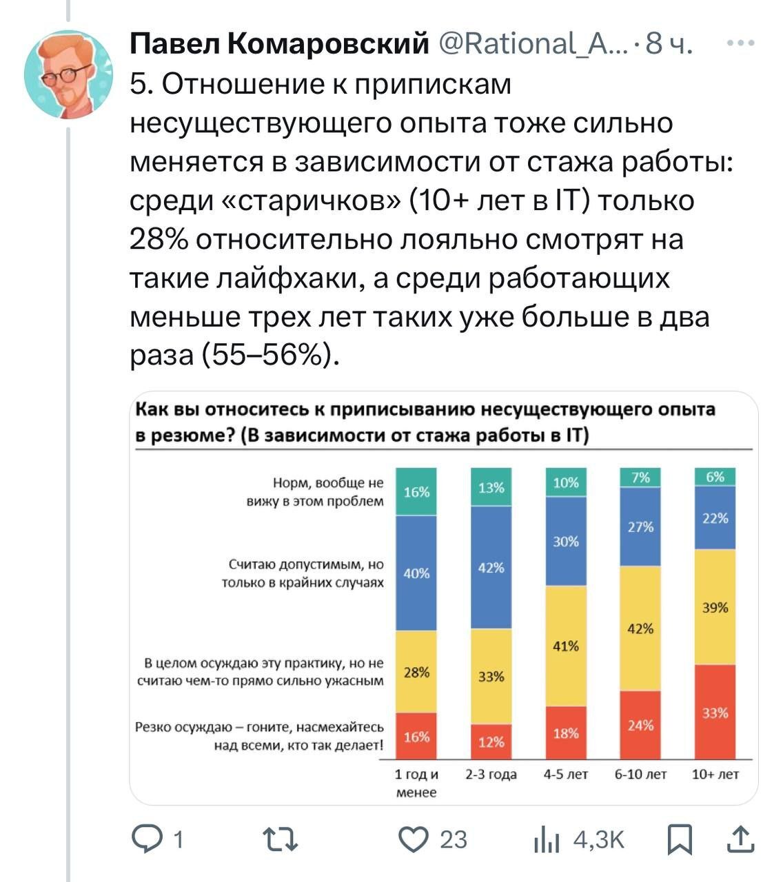 28 razbudimenya 1 год назад Баяны Примерно 20% джунов врут в резюме Парень опросил айтишников о работе и составил огромный тред с результатами.Не завидуем. X (Twitter) Скриншот IT Джун Тред Длиннопост Ещё 0
