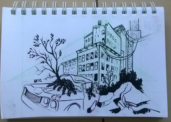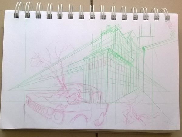 1. Сделала эскиз в карандаше Тут можно заметить как тупо я накосячила с перспективой дороги, потому что она идет совсем не в точки схода, а прямиком на детородный орган. Понятия не имею почему я увела эти линии именно так, но дело сделано.