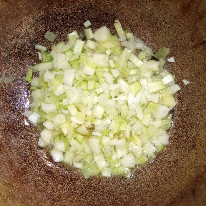Растопить на сковороде 50 г. смальца/масла сливочного, или налить растительное. Традиционно использовали говяжий смалец. Сейчас часто применяют масло. По сути, сюда уместен любой животный жир или же подсолнечное масло.  В горячий жир бросить мелко рубленый лук.