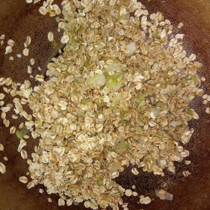 Добавить овсянку (исконно – дроблёный овёс. Также допустимо, с учётом современных реалий, использовать хлопья «среднего размера». Только не быстрого приготовления.)
