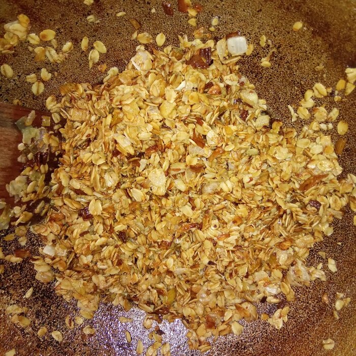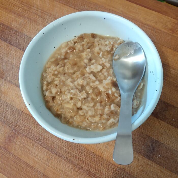 Второе – сварить из этого кашу. Просто добавить молока или воды и проварить.  У меня оставалась треть стакана со вчера, я добавил туда ещё 2/3 стакана воды, кинул в пароварку (чтоб не пригорело в моё отсутствие) и пошел работать в огород. Получилась весьма неплохая каша с насыщенным вкусом. Если на этапе обжарки добавить фарш а уж потом долить воды и сварить кашу – будет вообще шикарно.