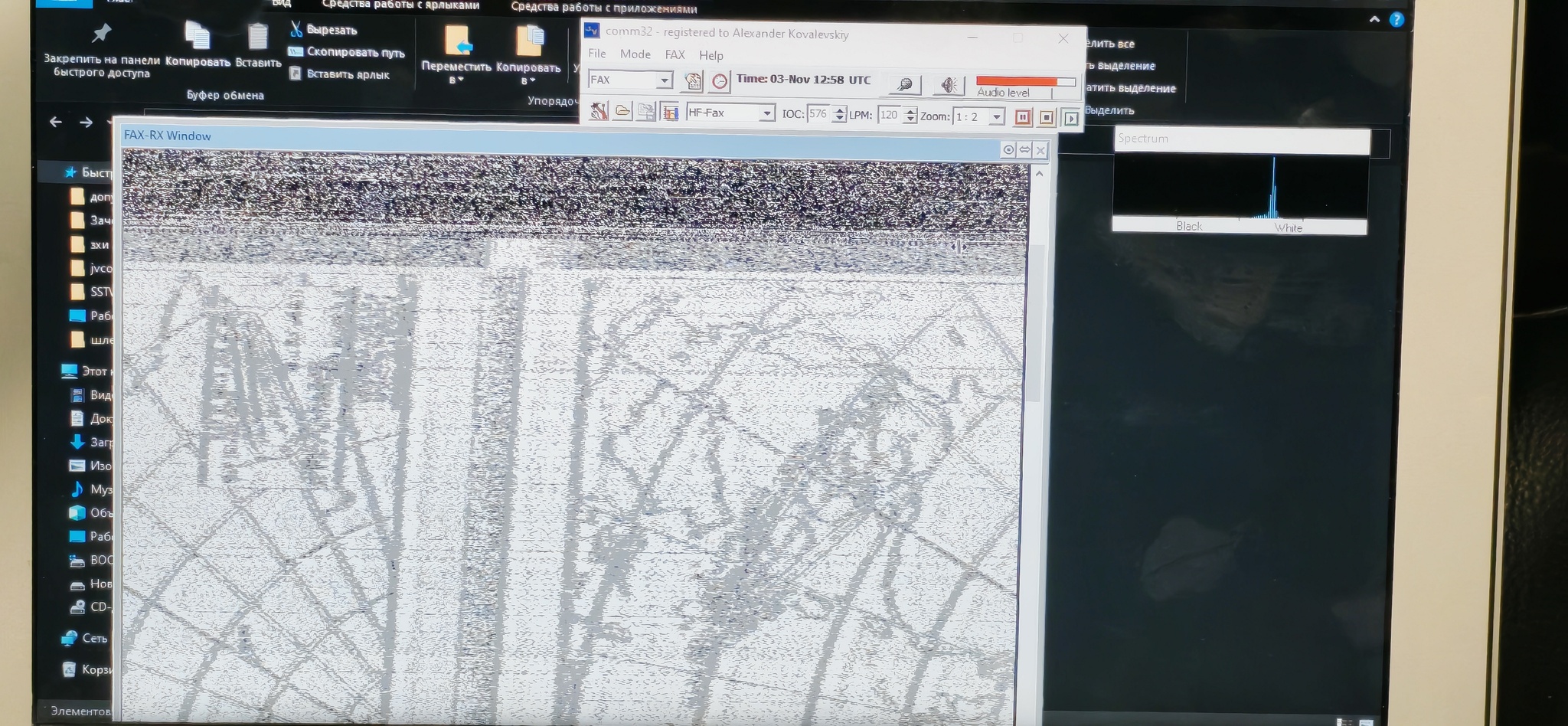 В одних программах (MixW, Fldigi) на сигнал факса нужно поставить метку на водопаде, чтобы маркеры точно совпали с частотами уровней белого и черного (удобнее всего это сделать, когда факс не передается, а есть только одна несущая, совпадающая с уровнем белого). В других (Black Cat, Jvcomm) нужно настроить сам приемник, чтобы уровень белого оказался на частоте ровно 2300 Гц, а черного -- 1480 Гц. Незначительный (50-100 Гц) сдвиг настройки делает картинку бледной или на сером фоне, а более значительный ее вовсе разрушает.