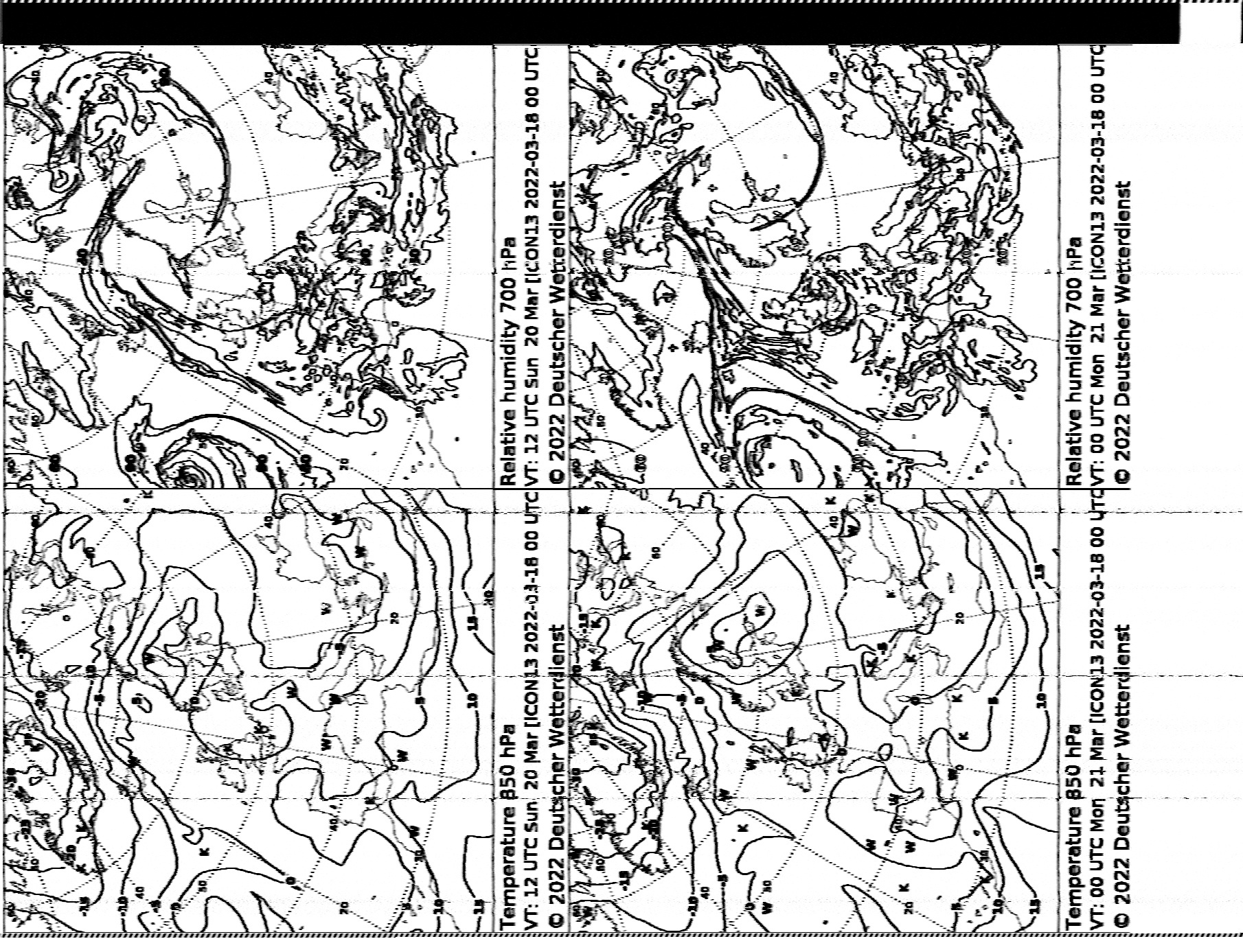 Принимаются также отечественные станции. Мурманск-Радио на частоте 6446 кГц (другие частоты сейчас не функционируют). В 18:50 GMT передается расписание в режиме 90lpm (вот вам и то самое редкое исключение), остальное время -- карты суточного и полуторасуточного прогноза, анализа состояниия моря, температуры с указанием местоположения айсбергов и прогноза их перемещения. Карты на русском языке.