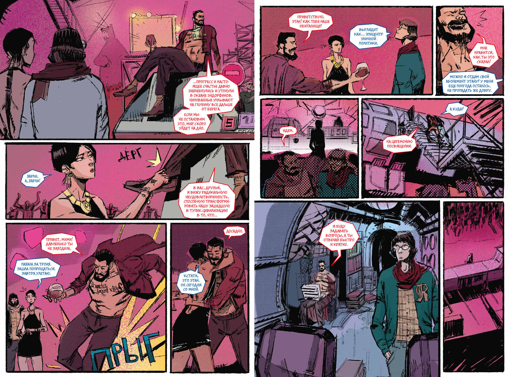 Визуальное решение романа — отдельная тема для разговора. Стилистика нарочито «черновая», динамичная. Однако здесь эта эстетика работает не на чистый экшен, а на создание ощущения хаотичного, живого мира. Примечателен и сам подход к производству, напоминающий работу над крупным кинопроектом: над архитектурой конурбации работал отдельный художник, привлекались консультанты. Это говорит о переходе отечественного комикса от кустарного производства к индустриальному, что, безусловно, является знаком зрелости рынка.