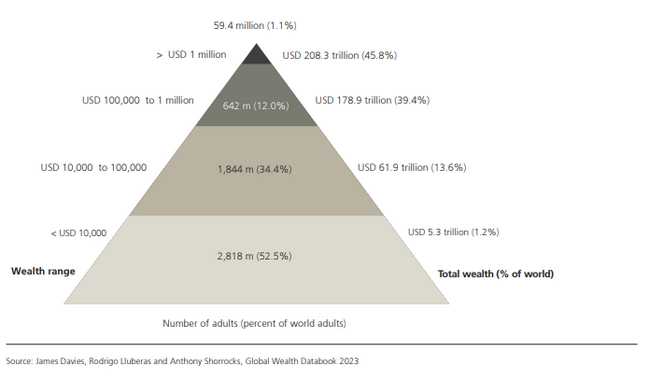 Первая ступень - 3 миллиарда человек (53% всей выборки) и 1% мирового капитала. Средняя стоимость всех активов у участника меньше 100 000 рублей;