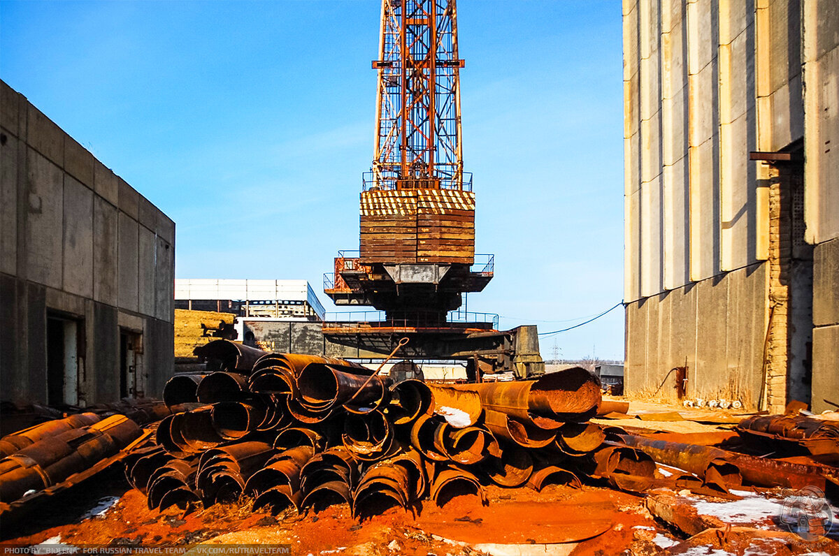 У основания крана валялась куча труб, вероятно их должны были использовать при строительстве. Хотя, что-то мне под сказывает что кран сюда пригнали для того, что бы станцию разбирать, а не строить.