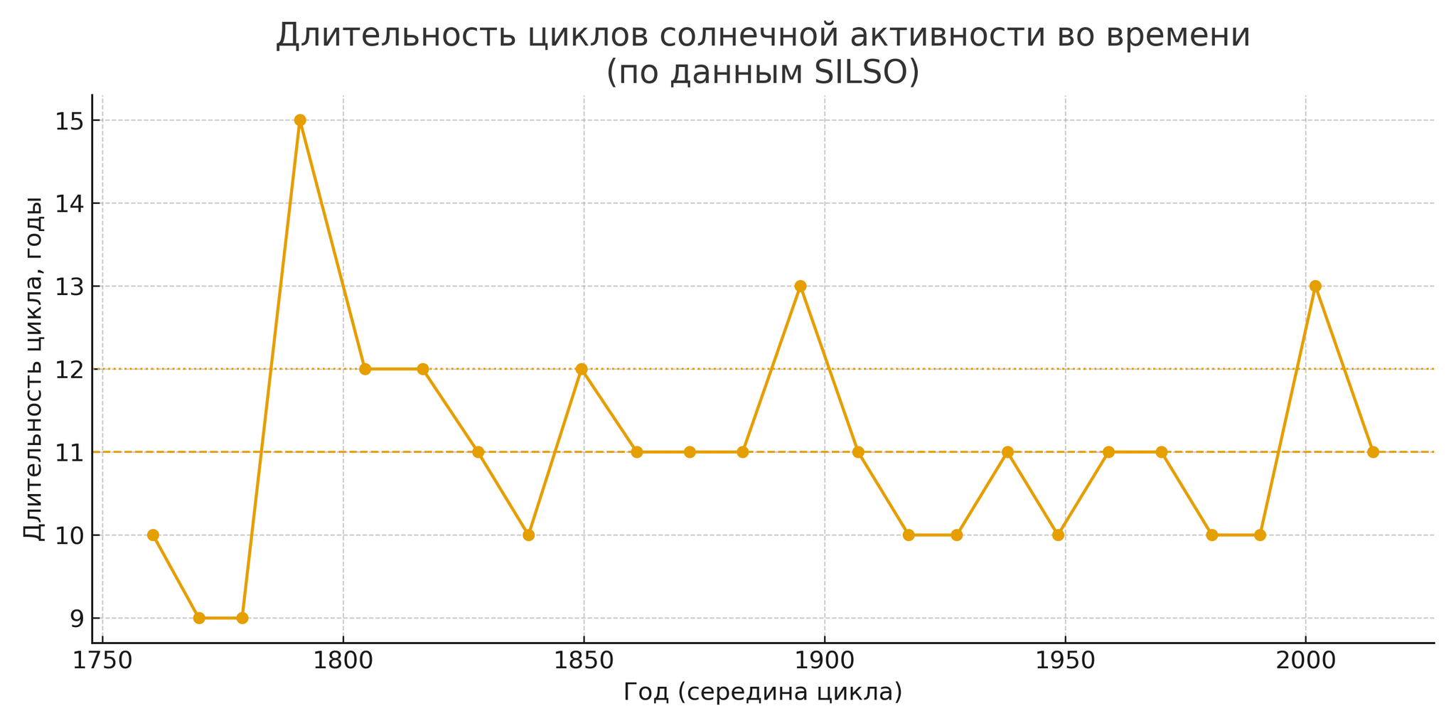 Этот график подтверждает важный вывод: цифра 12 лет — это не произвольное округление, а тот диапазон, в котором концентрируется значительная доля реальных циклов на всём протяжении инструментальной эпохи наблюдений.
