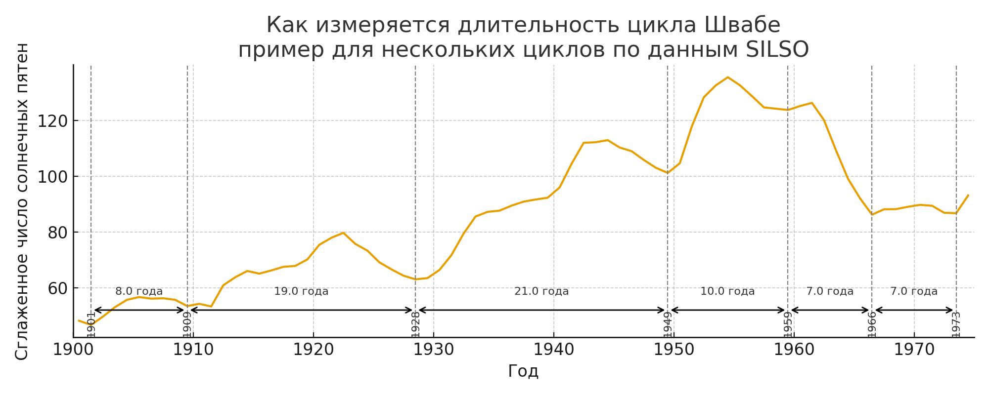 По горизонтальной оси отложены годы (например, 1900–1975). По вертикальной оси — сглаженное годовое число солнечных пятен. На графике показана плавная кривая солнечной активности за этот период. На ней вертикальными пунктирными линиями отмечены годы минимумов, возле каждой линии подписан год минимума. Между соседними минимумами нанесены двусторонние стрелки с подписью вида «10,4 года», «11,2 года» и т. д.