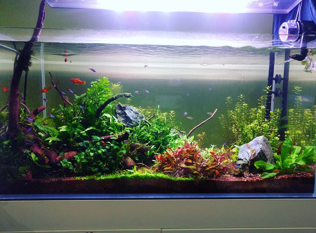 Итак, свет+удобрения. Все! Никакой химии больше. Свет неяркий, в пересчете на ватты по люминисцентным лампам вам нужно 0,5 ватт на 1 литр воды, либо же 35 люменов на литр. Если аквариум 100 литров, то надо 50 ватт люминисцентного света или же аналогичного количества светодиодного света.