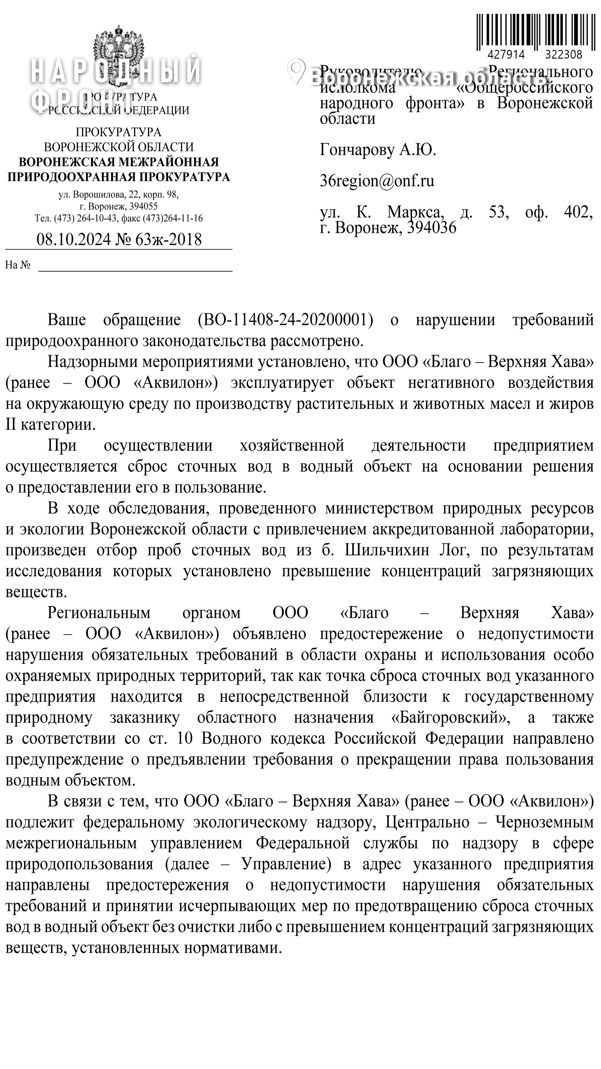 Напомним, в конце сентября Народный фронт рассказал, что расположенный в поселке Виноградовка Верхнехавского района завод по переработке подсолнечного масла сливает в местный пруд не очищенные отходы. Президентское движение попросило надзорные ведомства подключиться в решению проблемы.
