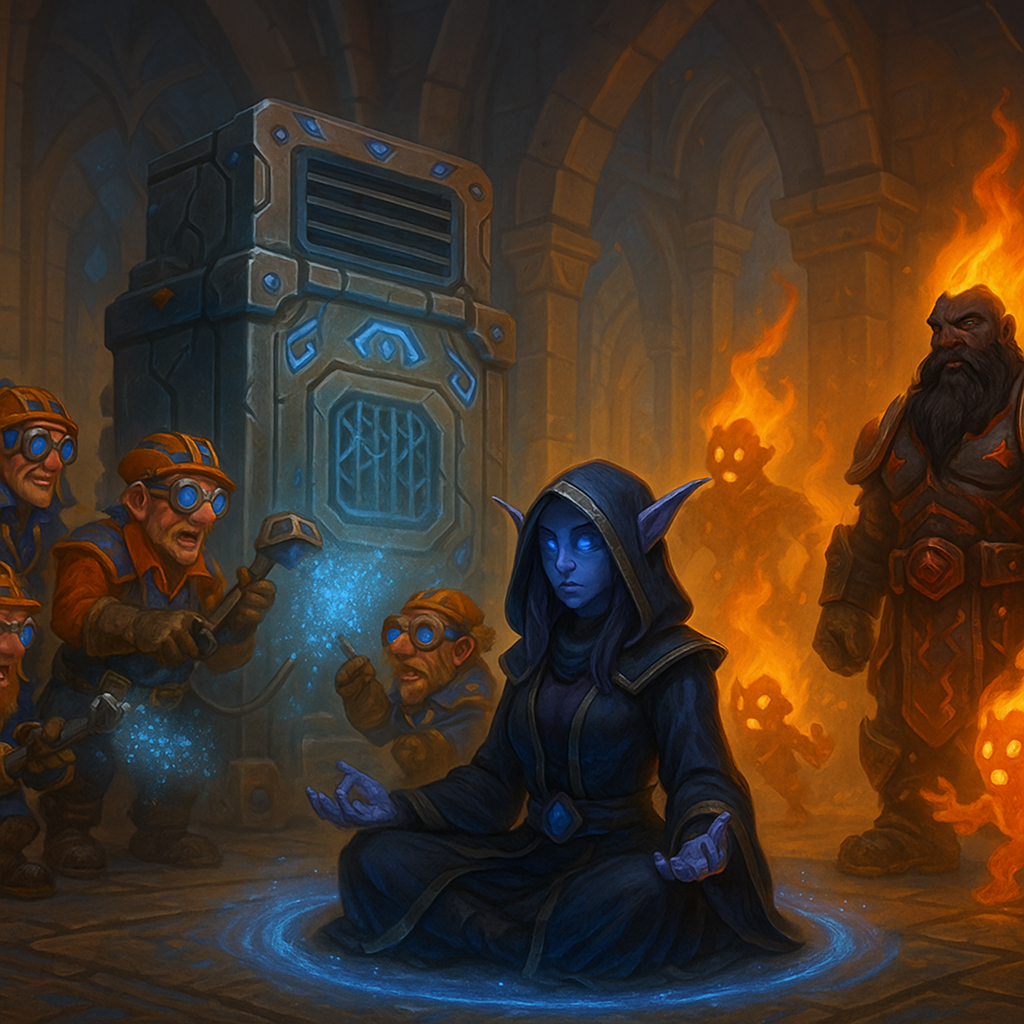 С раннего утра Аргус Хаус содрогнулся от шума: в северные залы прибыли гномьи инженеры — мастера аркано-техники, известные своим искусством чинить даже то, что давно пора было разобрать на запчасти. Их ритуал починки начался с раскладывания магических инструментов, громких заклинаний диагностики и глухого гномьего бормотания, от которого сами стены начинали вибрировать.