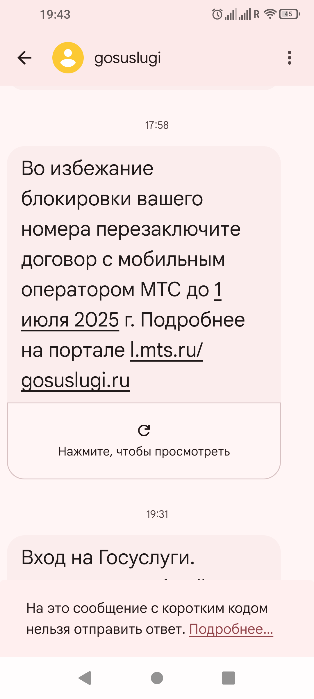 Сам гражданин Беларуси нахожусь там же пришла смс такая на российскую симку, пользуюсь ей,по ссылке переводит на госуслуги и там пишут нужно ехать в РФ в офис МТС и переоформить договор, может кто нибудь сталкивался с подобным? Чё делать? Ехать в РФ переоформлять времени особо нет😔