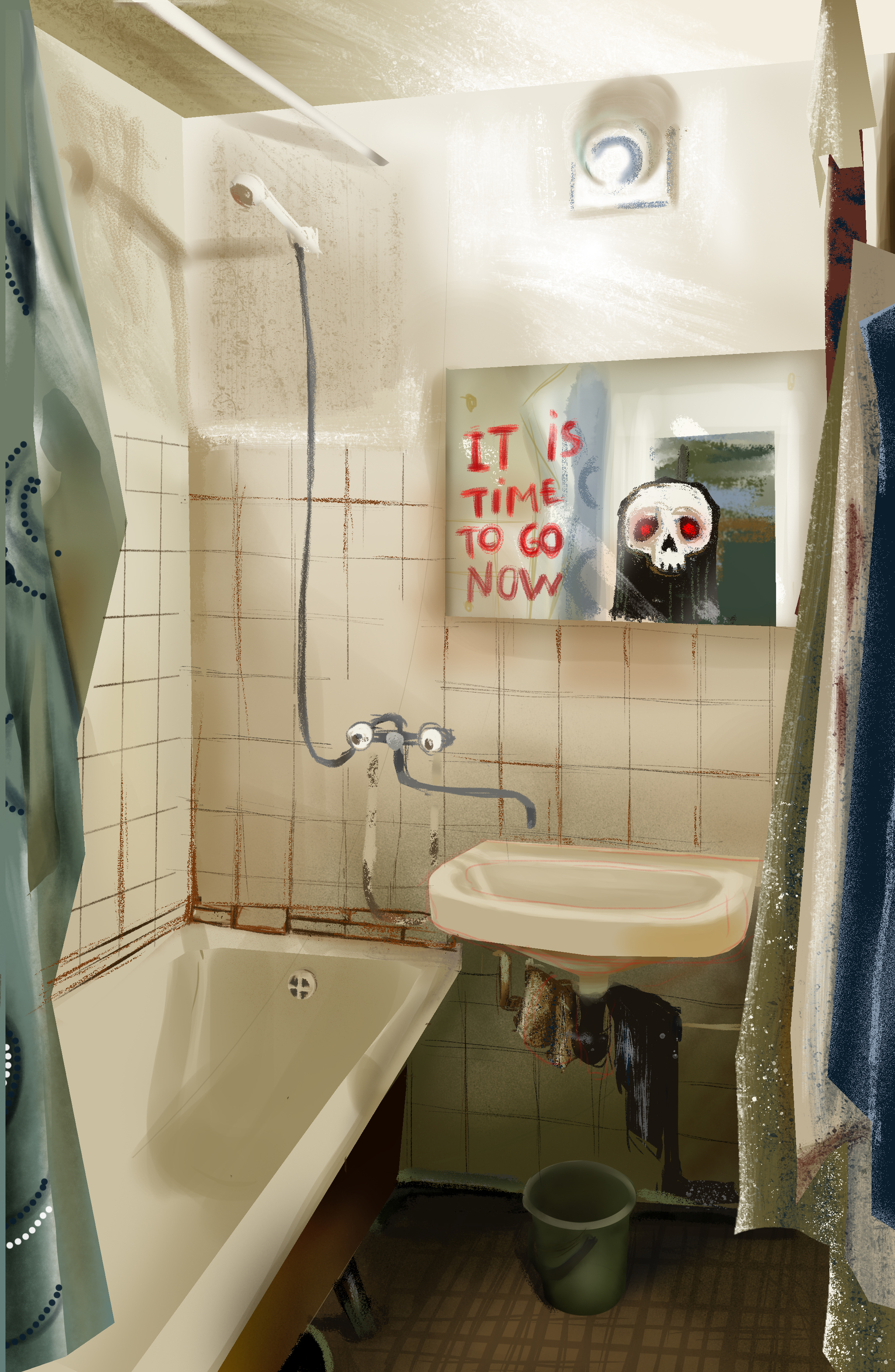 Rebelrebel1 "Пришло твое время" 4 года назад У бабушки мужа обнаружили ковид, что и вдохновило меня на картину. Бабушка жива и здорова. [моё] Цифровой рисунок Смерть Ванна Ещё 0