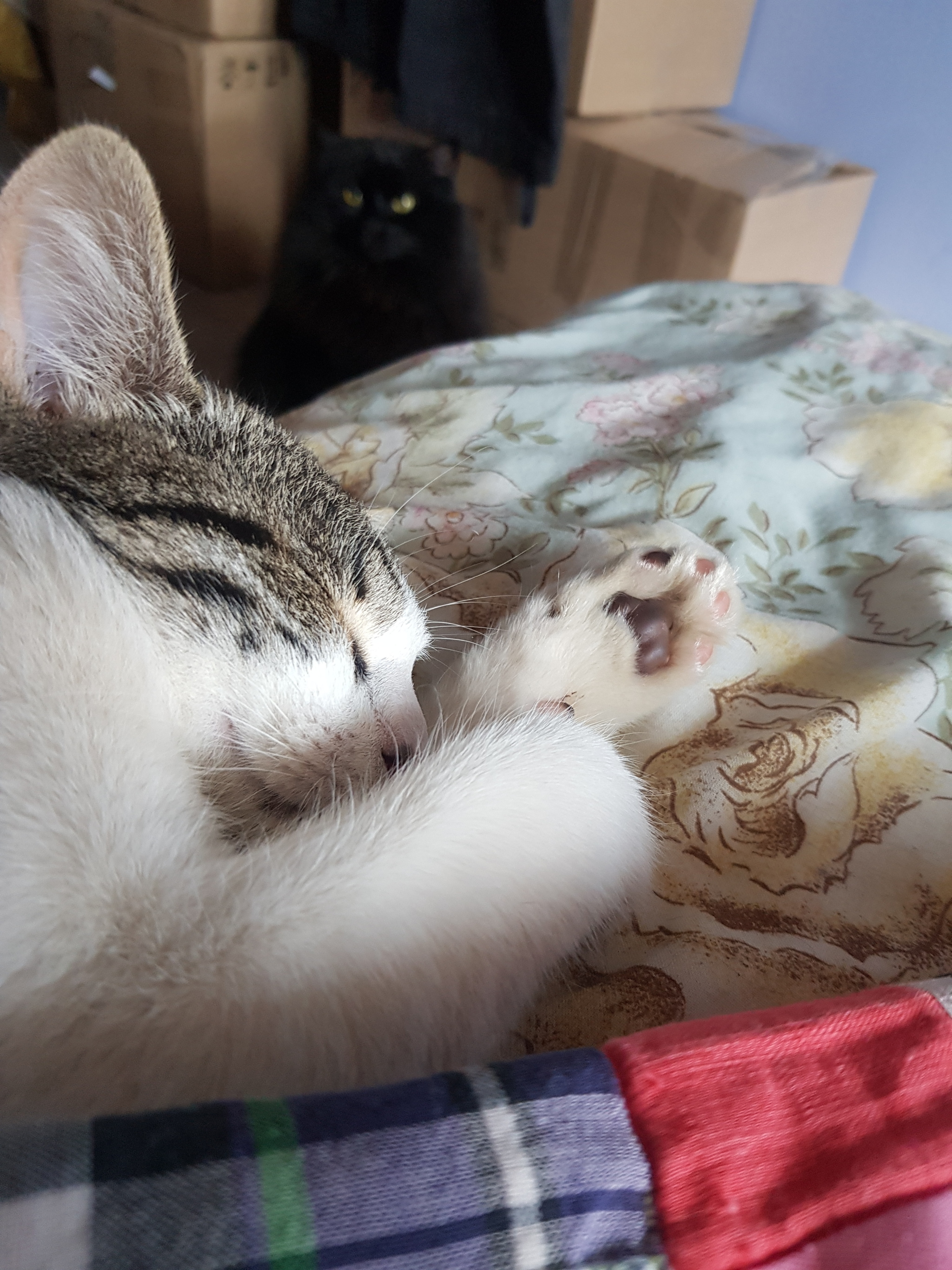 ...И вот глаза вылечили, приняли десять уколов по рецепту от ветеринара, таблетки допиваем, вес набрали, сопли прошли (но всё равно ещё почихиваем и похрюкиваем), с Беляшом дружим, дома не пакостим и никак наесться не можем. К ветеринару в город кота свозила прекрасная девушка-волонтёр Лиля, которая мне причинила уже столько добра и без этого кота, что не знаю, как ещё её отблагодарить...