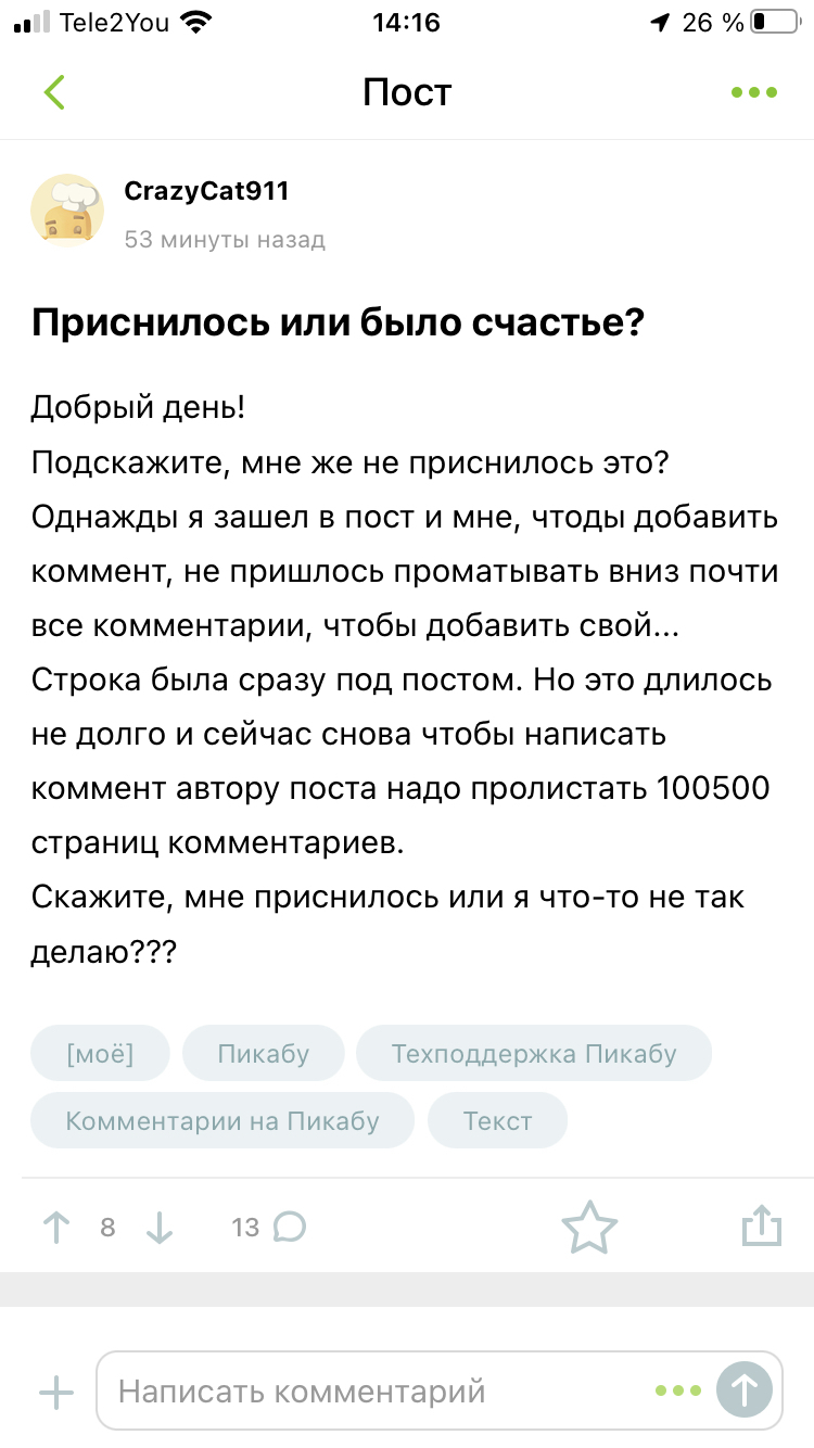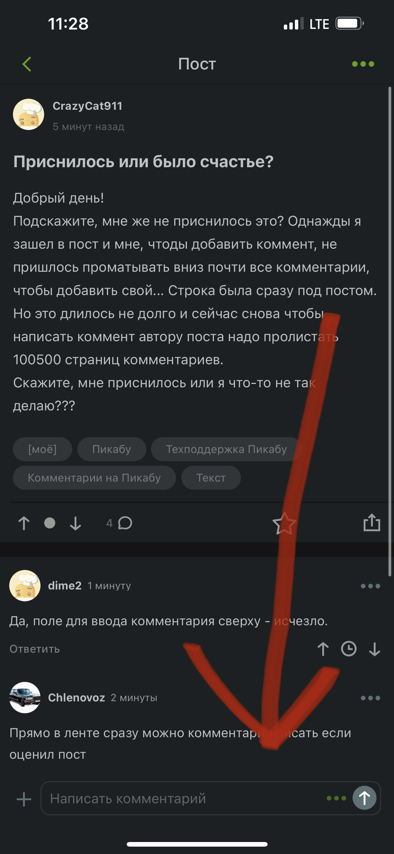 Подскажите, мне же не приснилось это? Однажды я зашел в пост и мне, чтоды добавить коммент, не пришлось проматывать вниз почти все комментарии, чтобы добавить свой... Строка была сразу под постом. Но это длилось не долго и сейчас снова чтобы написать коммент автору поста надо пролистать 100500 страниц комментариев.