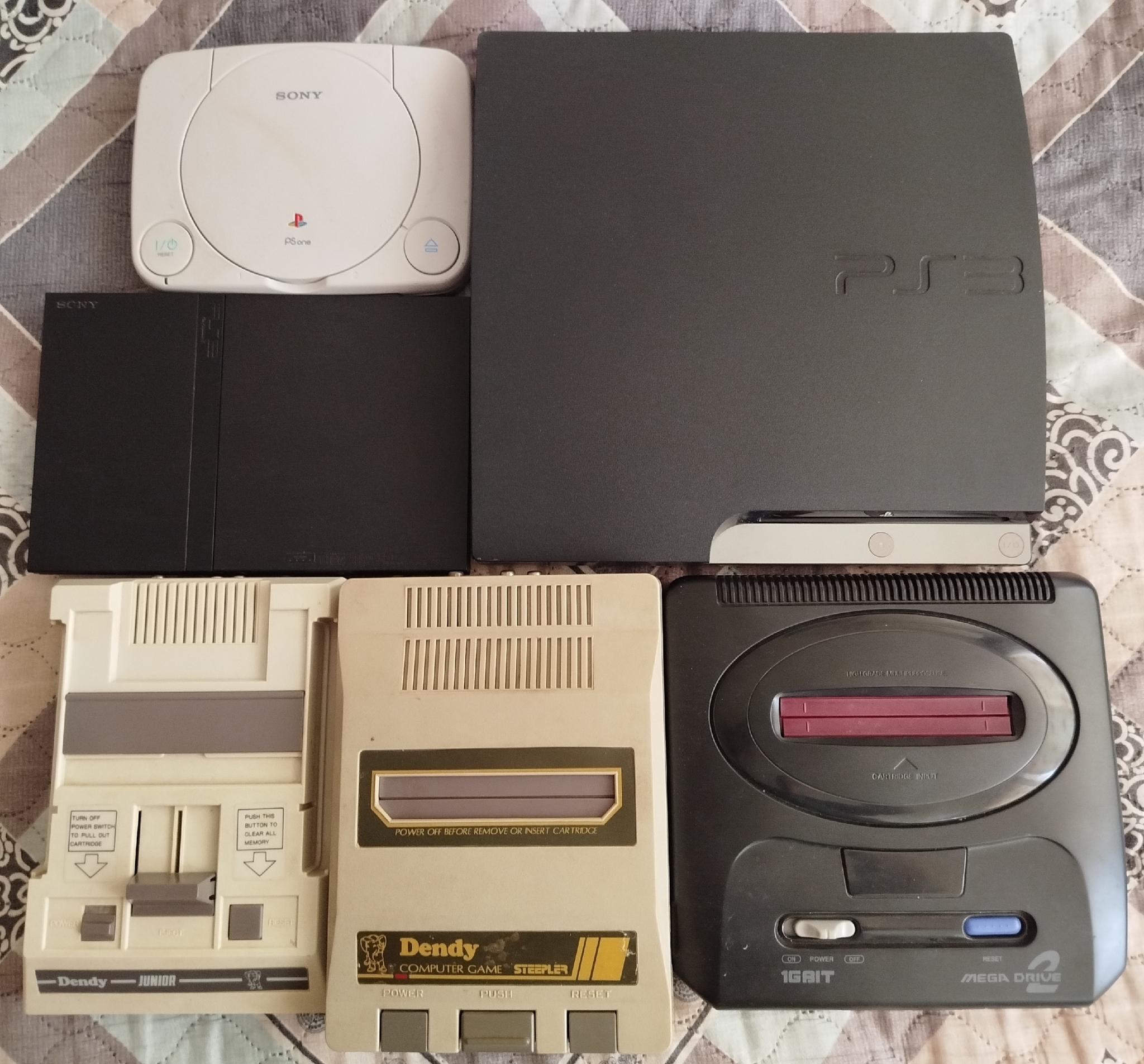 Приставки разной степени старости, от Денди до PlayStation 3. Картриджи Денди(Famicom) и Сега, книги с кодами, и немного фишек и карточек по черепашкам ниндзя.