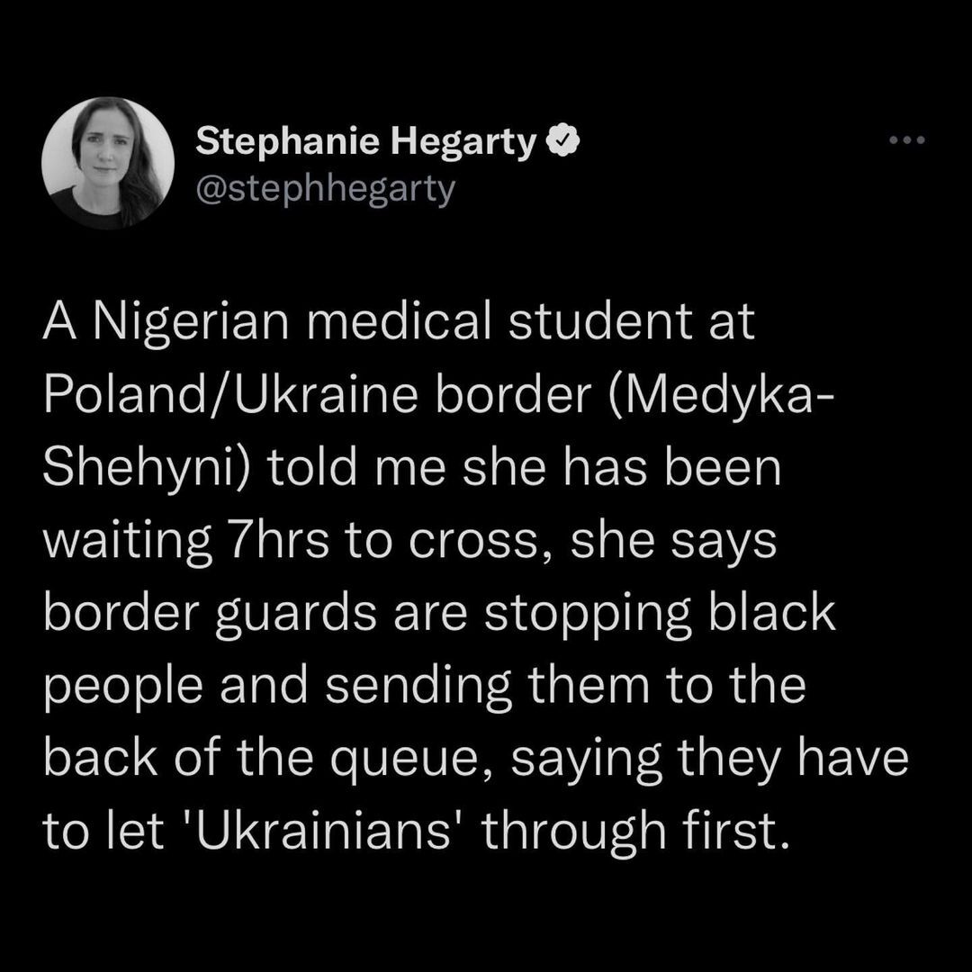 Поляки не позволяют беженцам, с не арийским цветом кожи, пересекать границу. Женщины с младенцами сидят часами, ожидая пока пройдут богоизбранные белые.
