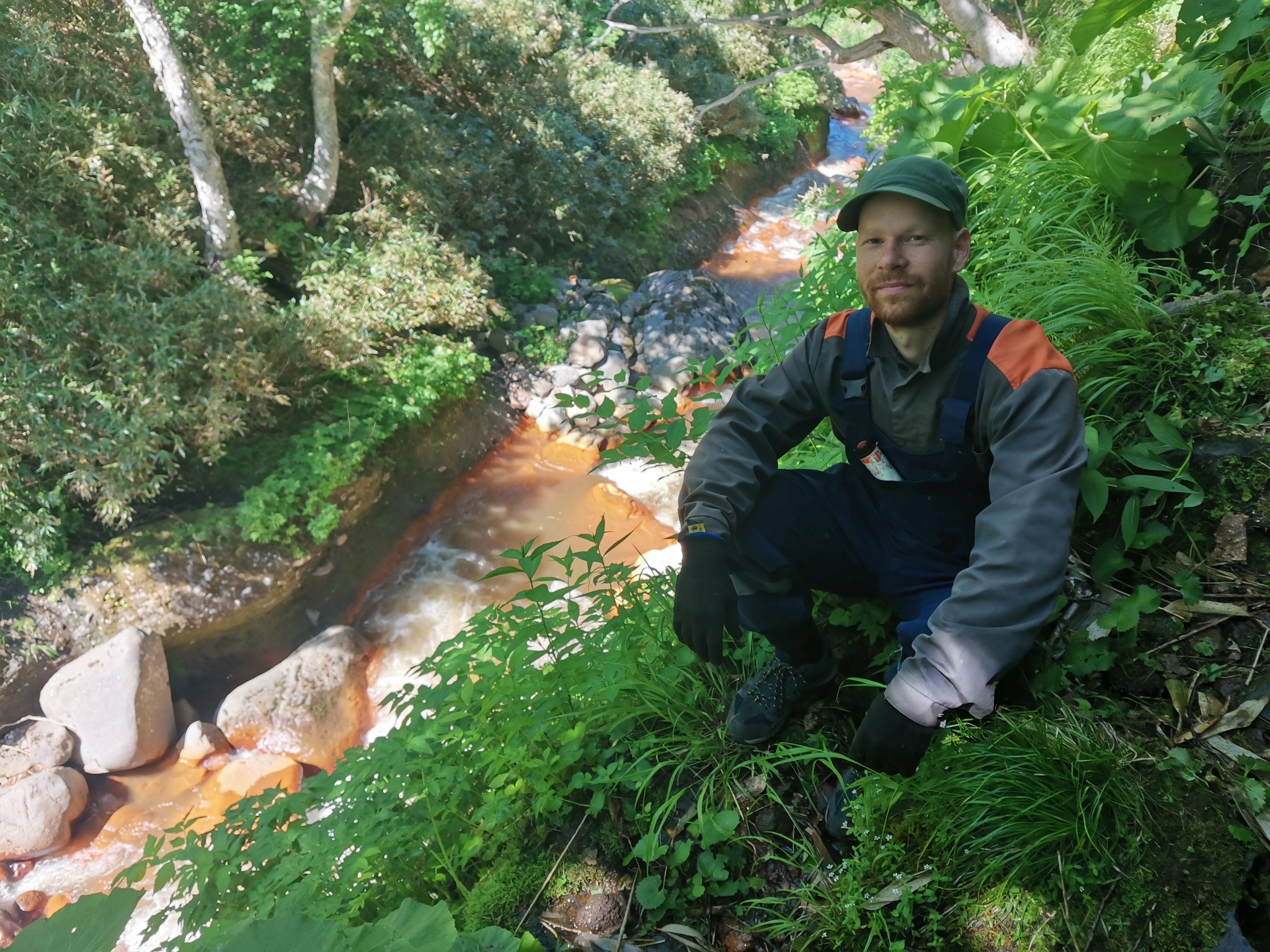 В последний рабочий день, мы пробились до водораздела, осталось только спуститься до речки по крутому склону. Спустившись вплотную, нашли родник. Родников на острове много, можно пополнить запас воды, вода чистая. Увидев нашу долгожданную речку, поняли что ее берег это отвесная гладкая скала, высотой метров десять. Пройти без трудностей вдоль берега не получалось, слишком опасно и заросли очень мешают идти. Если даже брать с собой какой-нибудь небольшой рюкзак и ружье, до хребта и обратно без ночевки не дойти. Все равно мы были очень рады как и наши организаторы.
