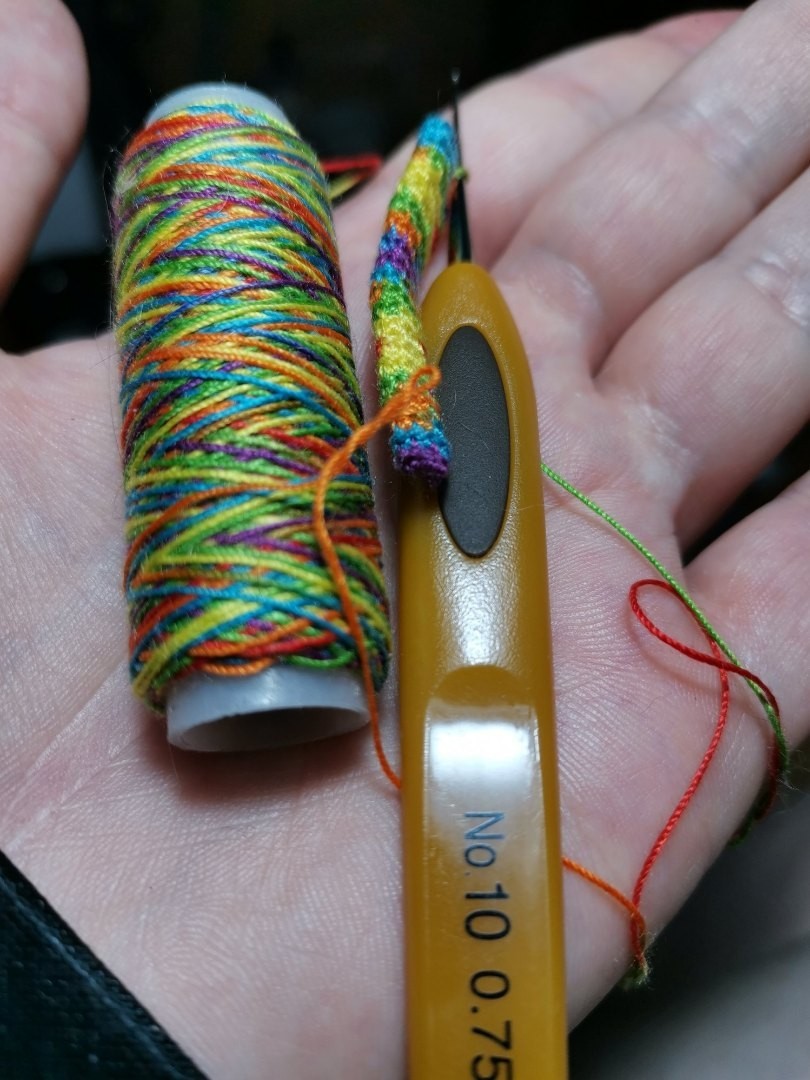 Связана из разноцветных, упоротых швейных ниток ооочень тоненьким крючком