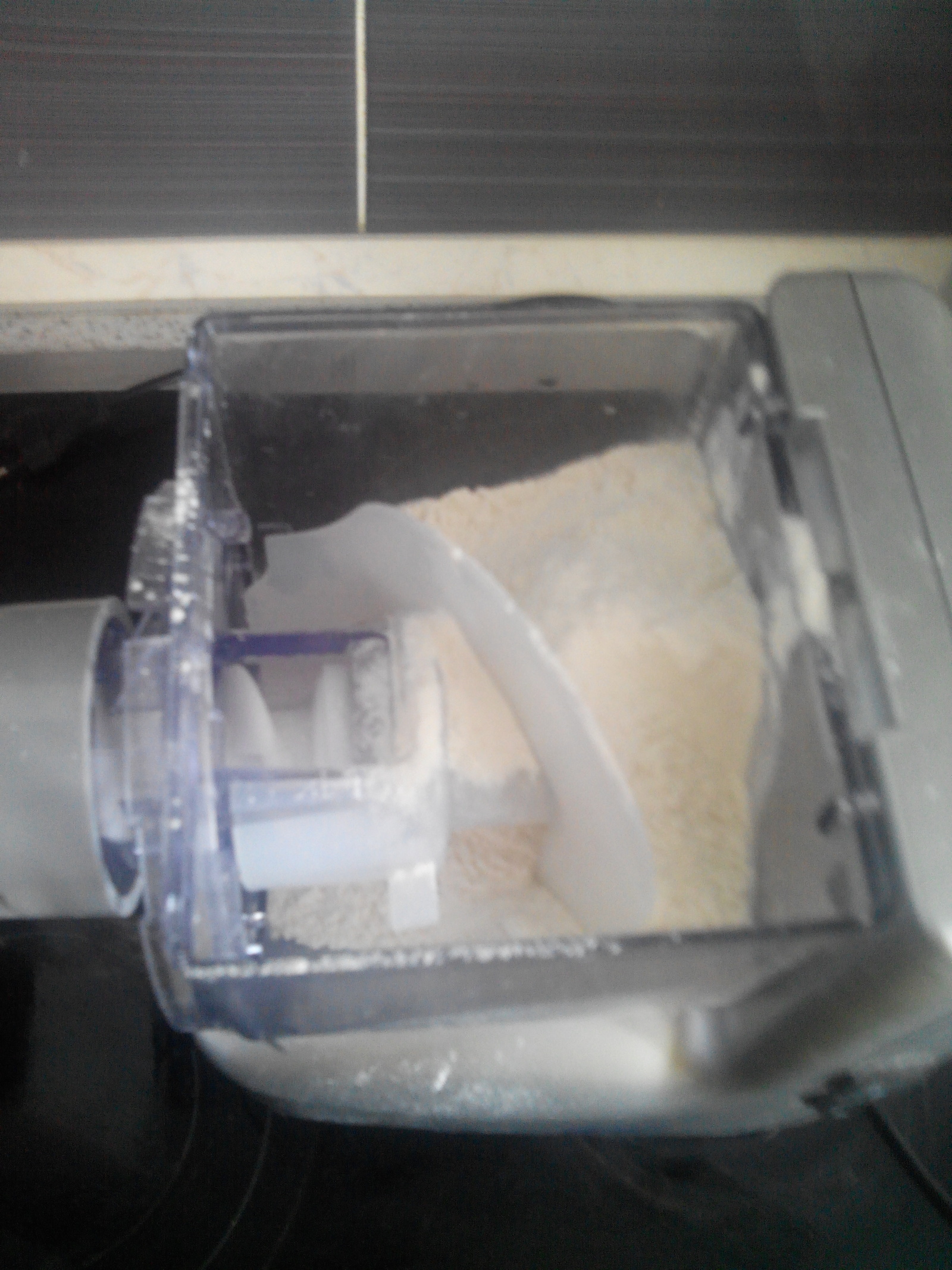 1) Засыпаем муку (максимум 400 грамм, лучше меньше, т.к. может затупить)